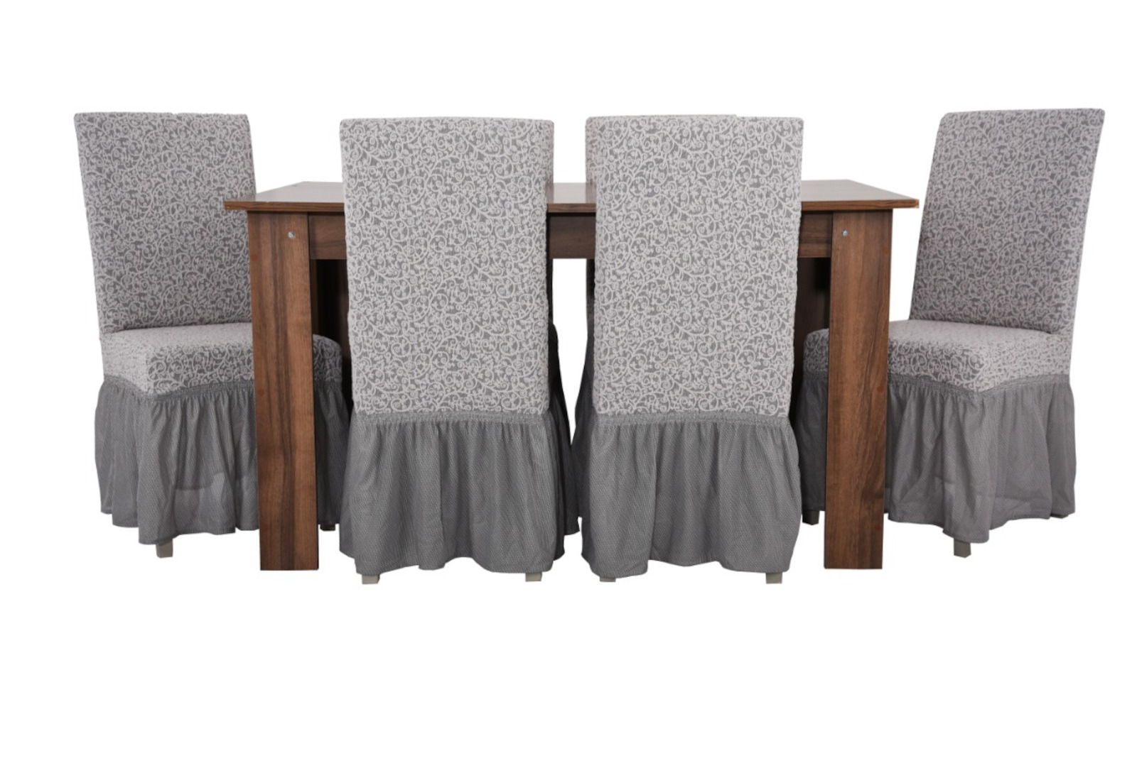 Чехол Жаккард с оборкой из трикотажной ткани, обладающий высокой плотностью и, при этом очень мягкий и хорошо растягивающийся, подойдет на стул практически любой конфигурации стандартного размера.