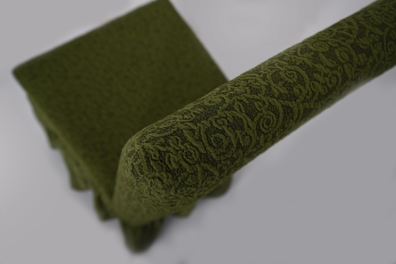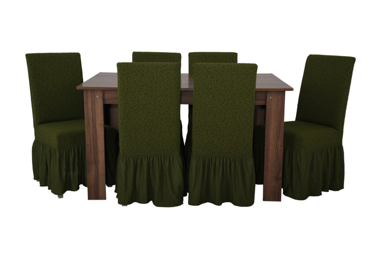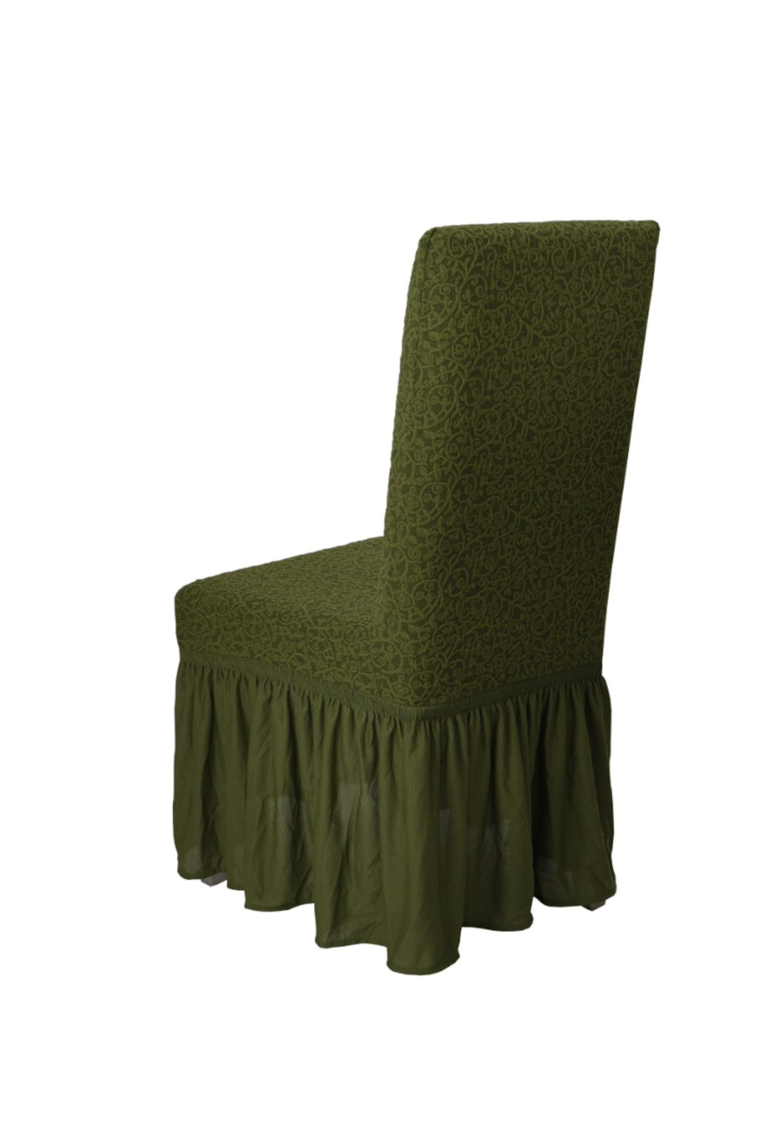 Чехол Жаккард с оборкой из трикотажной ткани, обладающий высокой плотностью и, при этом очень мягкий и хорошо растягивающийся, подойдет на стул практически любой конфигурации стандартного размера.