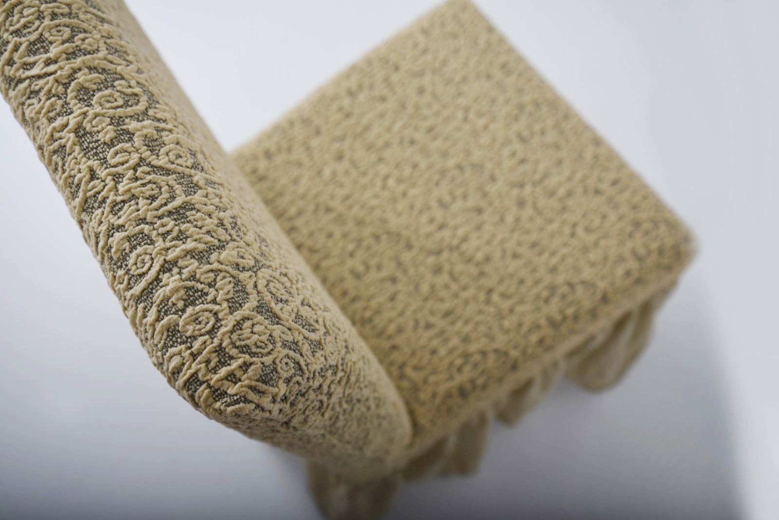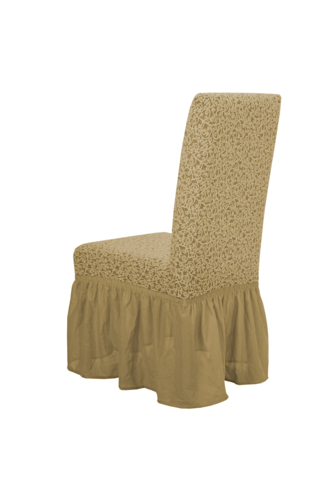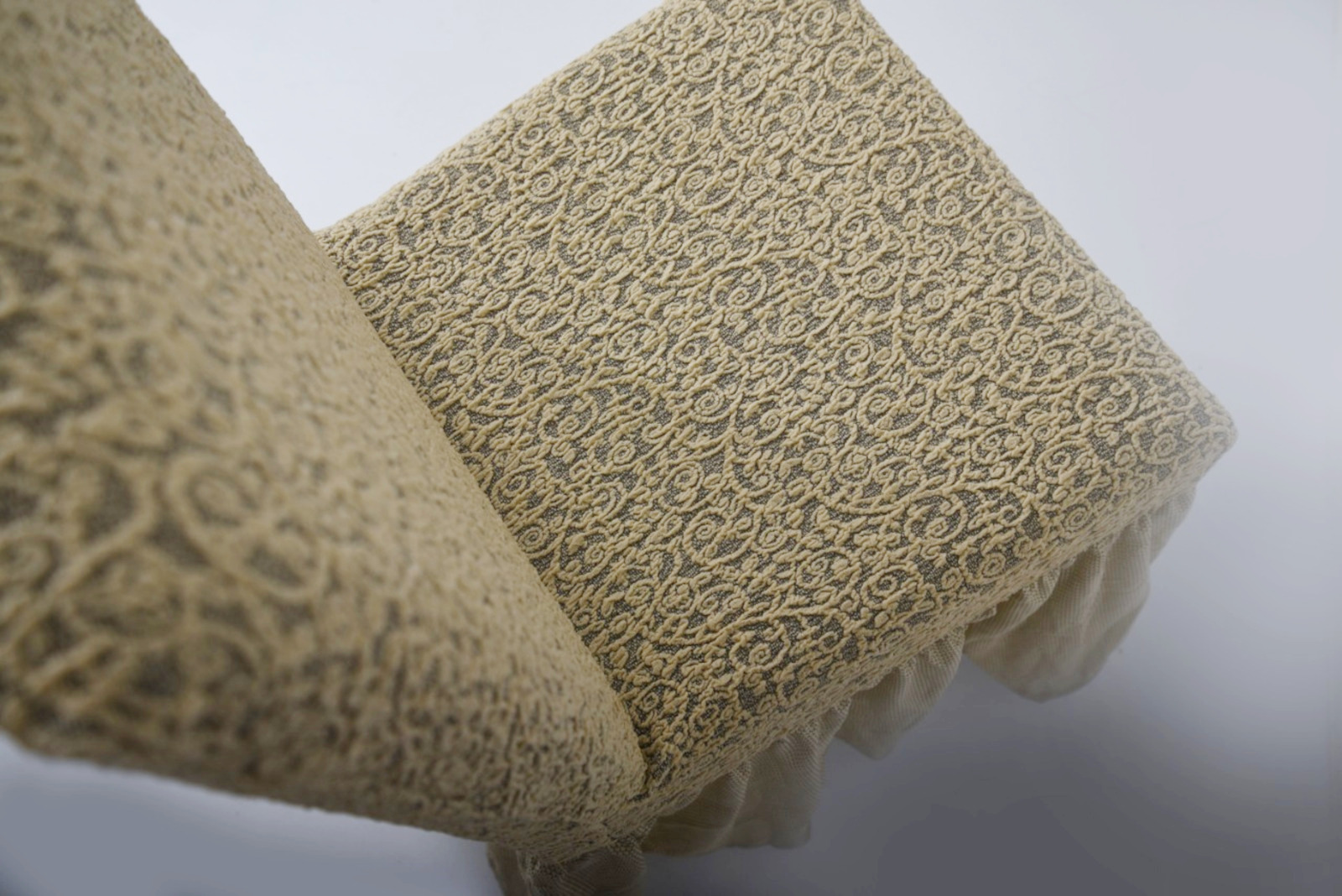 Чехол "Жаккард" с оборкой из трикотажной ткани, обладающий высокой плотностью и, при этом очень мягкий и хорошо растягивающийся, подойдет на стул практически любой конфигурации стандартного размера.