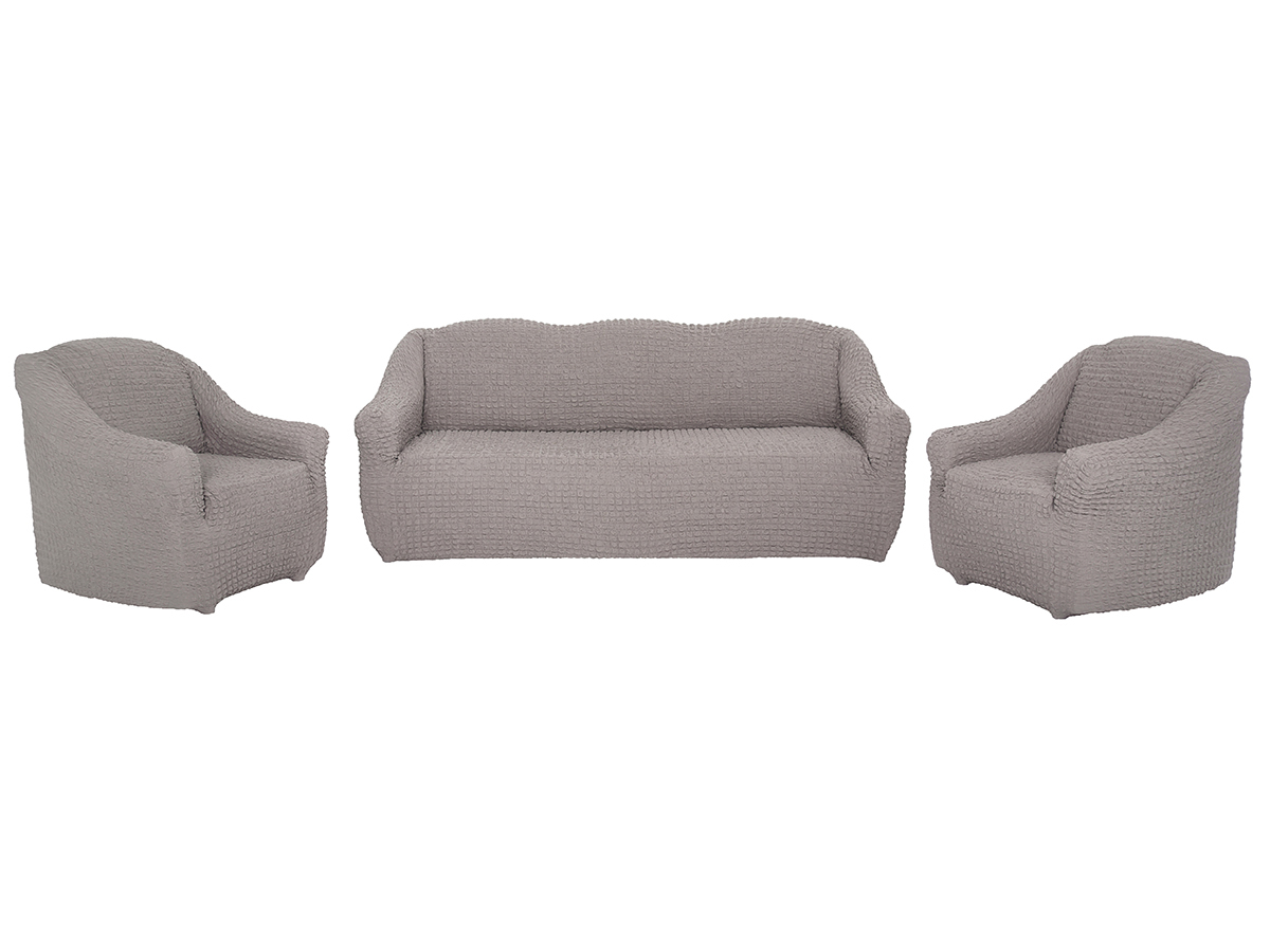 Комплект чехлов из эластичной ткани однотонного цвета, состоит из чехла на 3-х местный диван и 2-х чехлов на кресла.