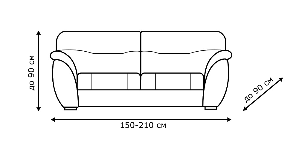 Размеры дивана: длина от 150 до 210 см, высота до 90 см, глубина до 90 см.