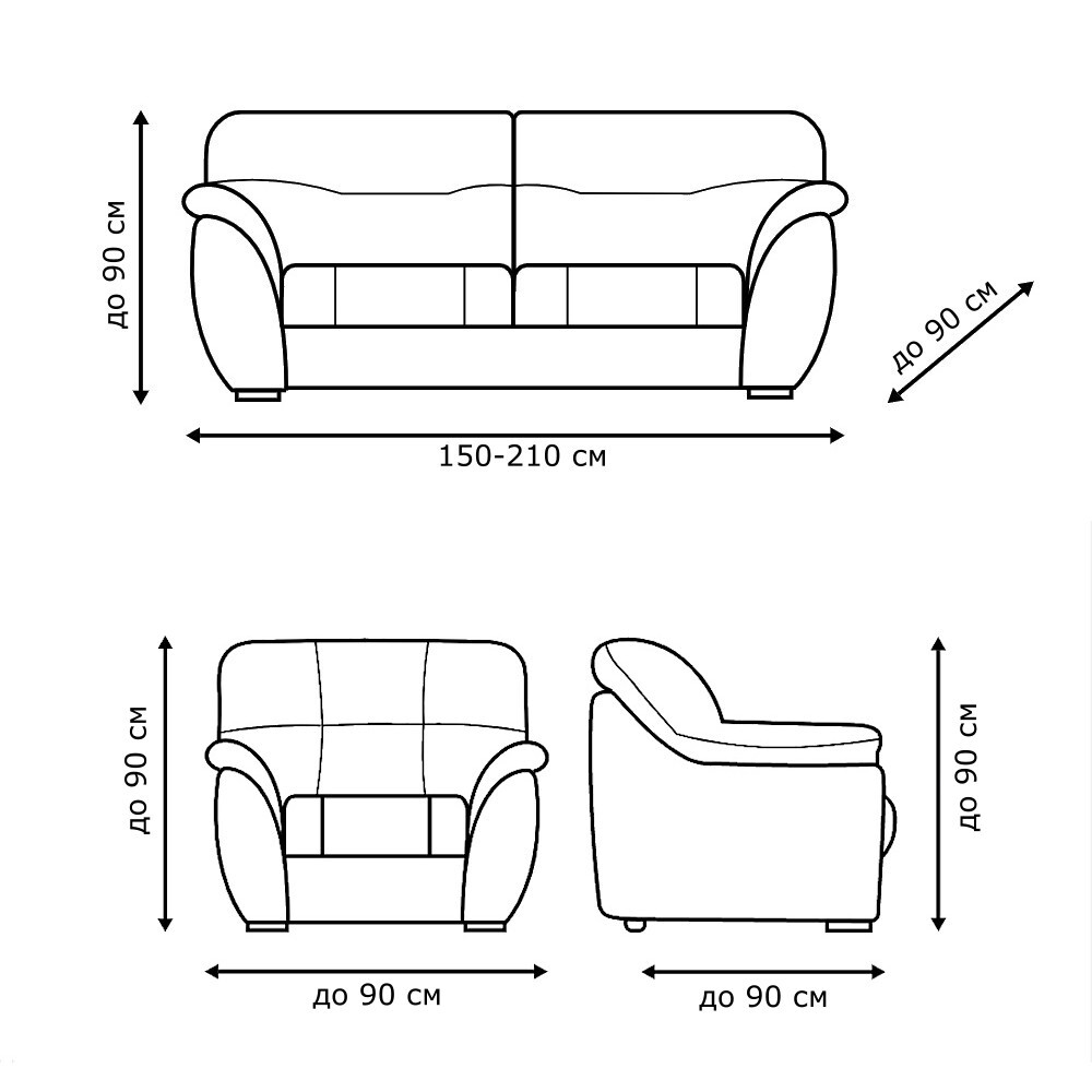 Возможная длина кресел от 50 до 90 см, длина дивана от 150 до 210 см, высота и глубина мебели до 90 см.