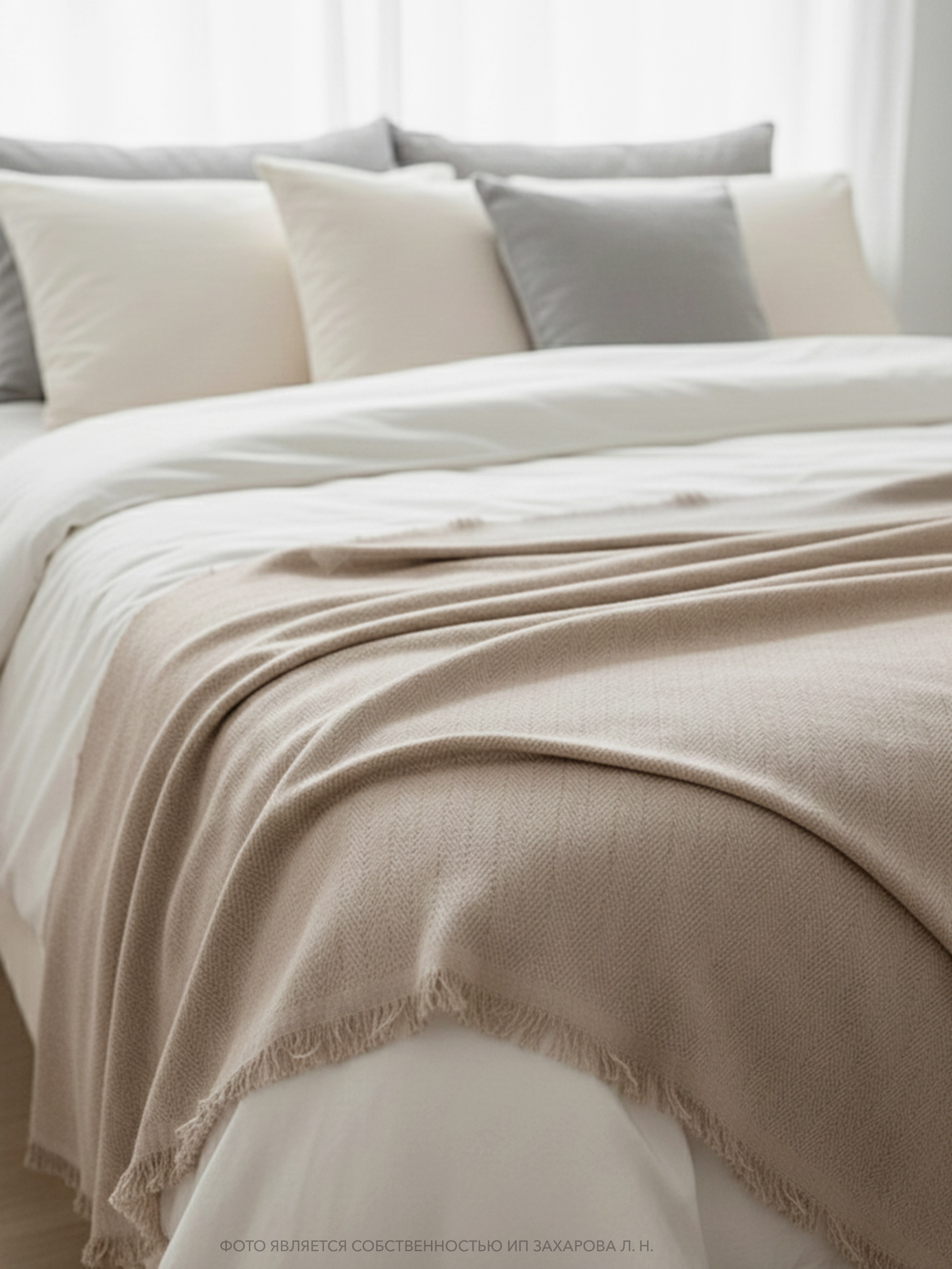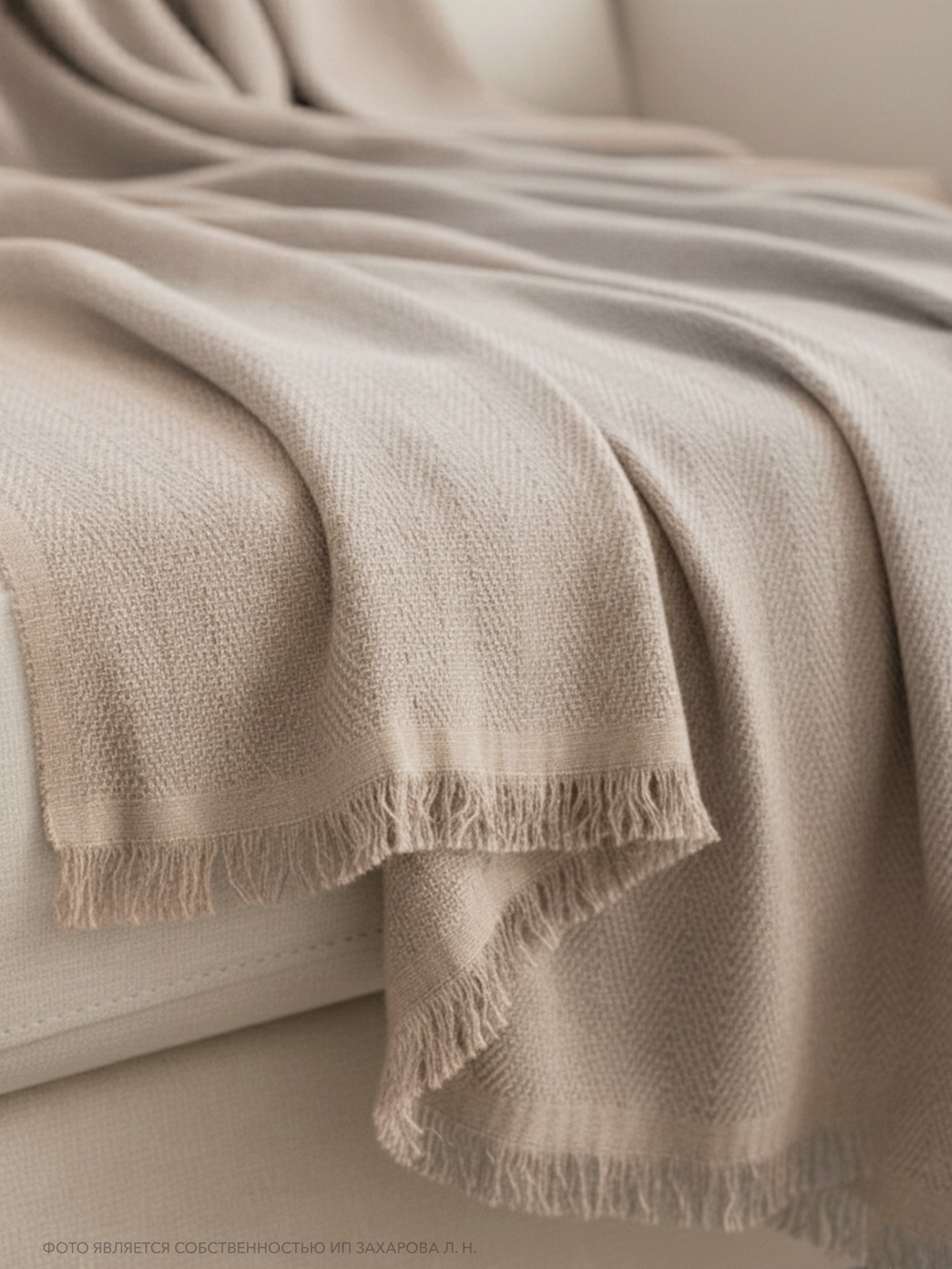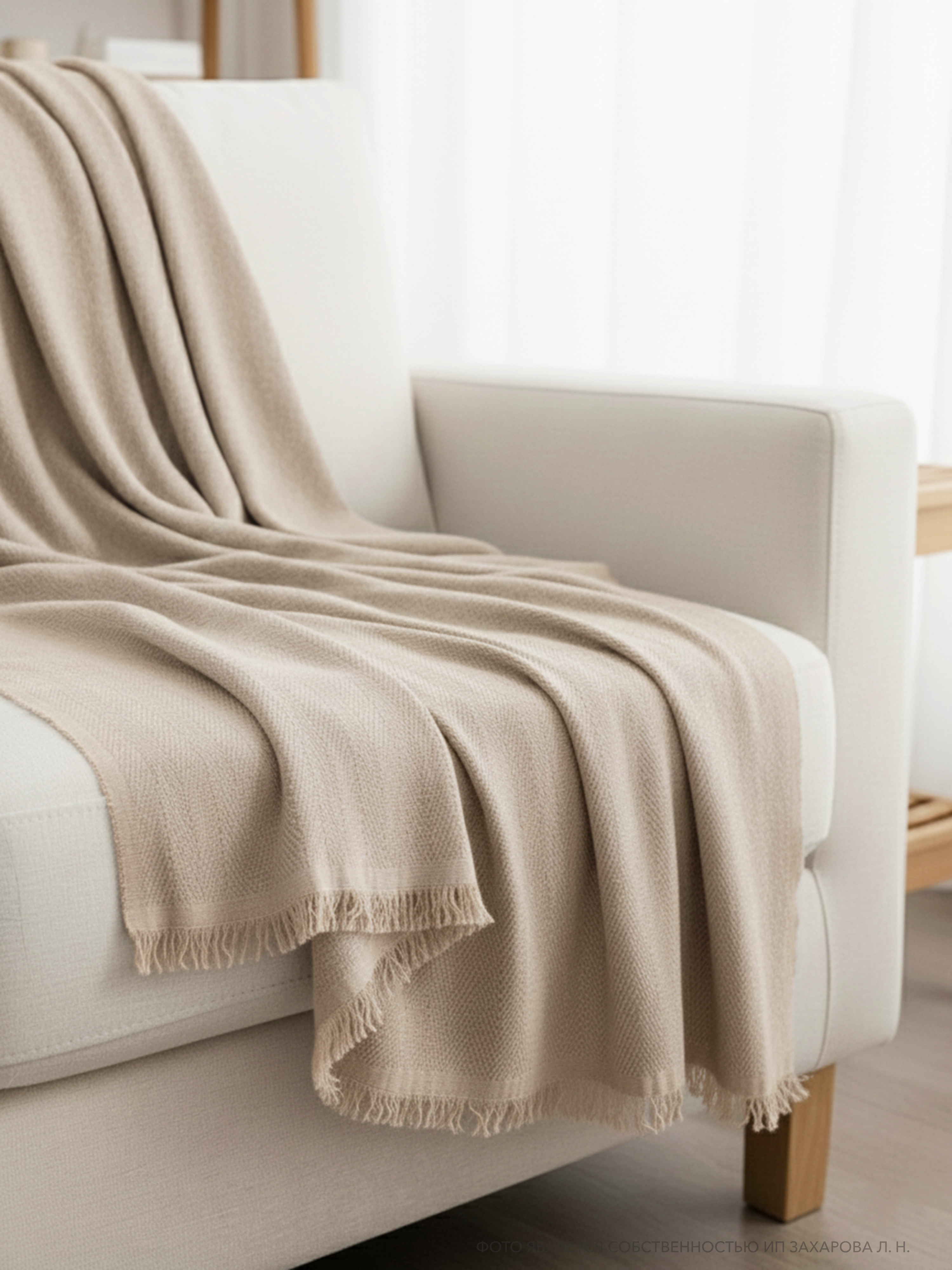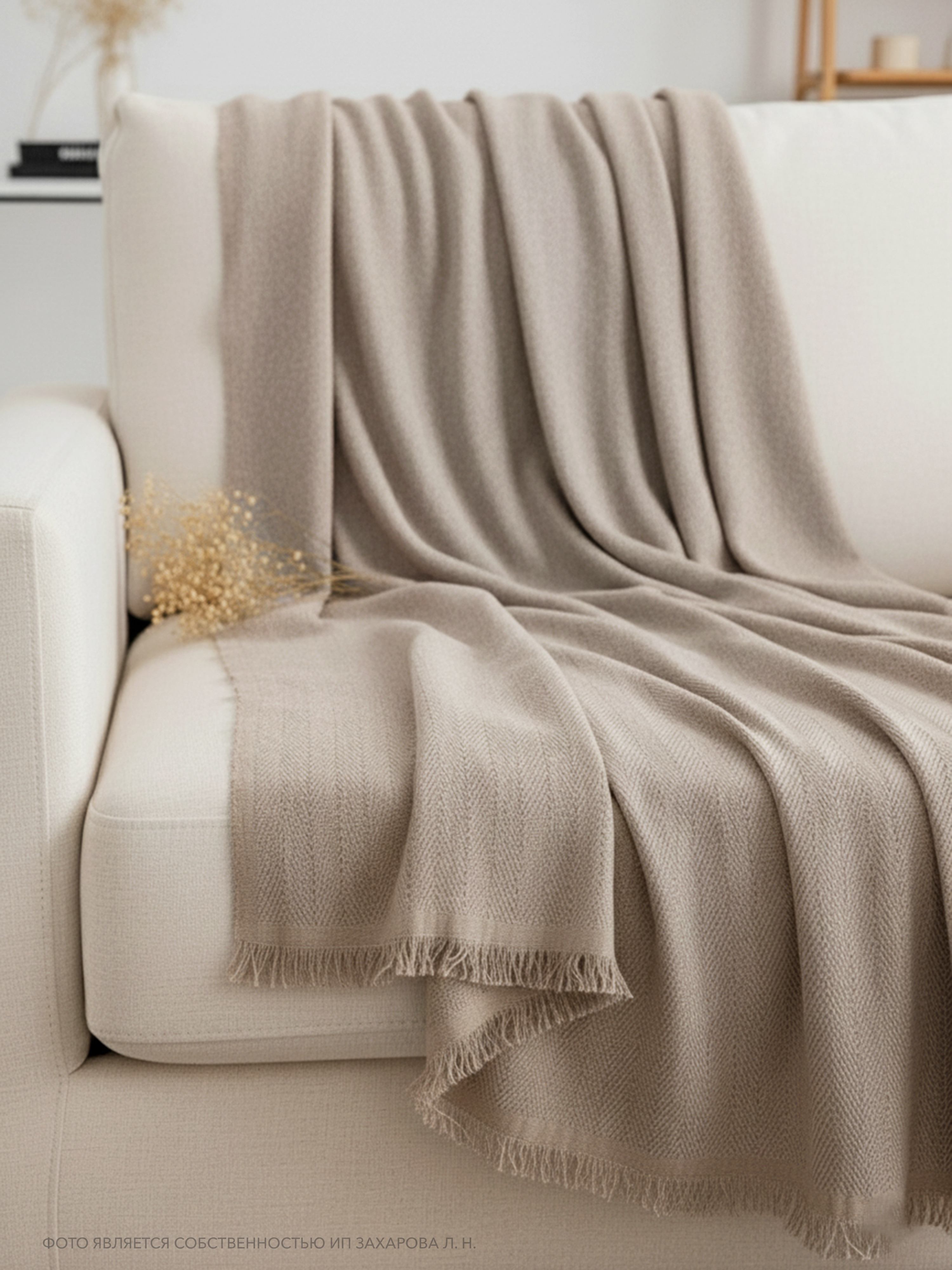 Плед имеет ткань в мелкий рубчик и кисточки по двум сторонам, что придает ему элегантный и стильный вид. Он универсален и подходит для всех сезонов года, так как его можно использовать в качестве пледа или покрывала. Кроме того, он может служить в качестве одеяла, если вам нужно дополнительное тепло.