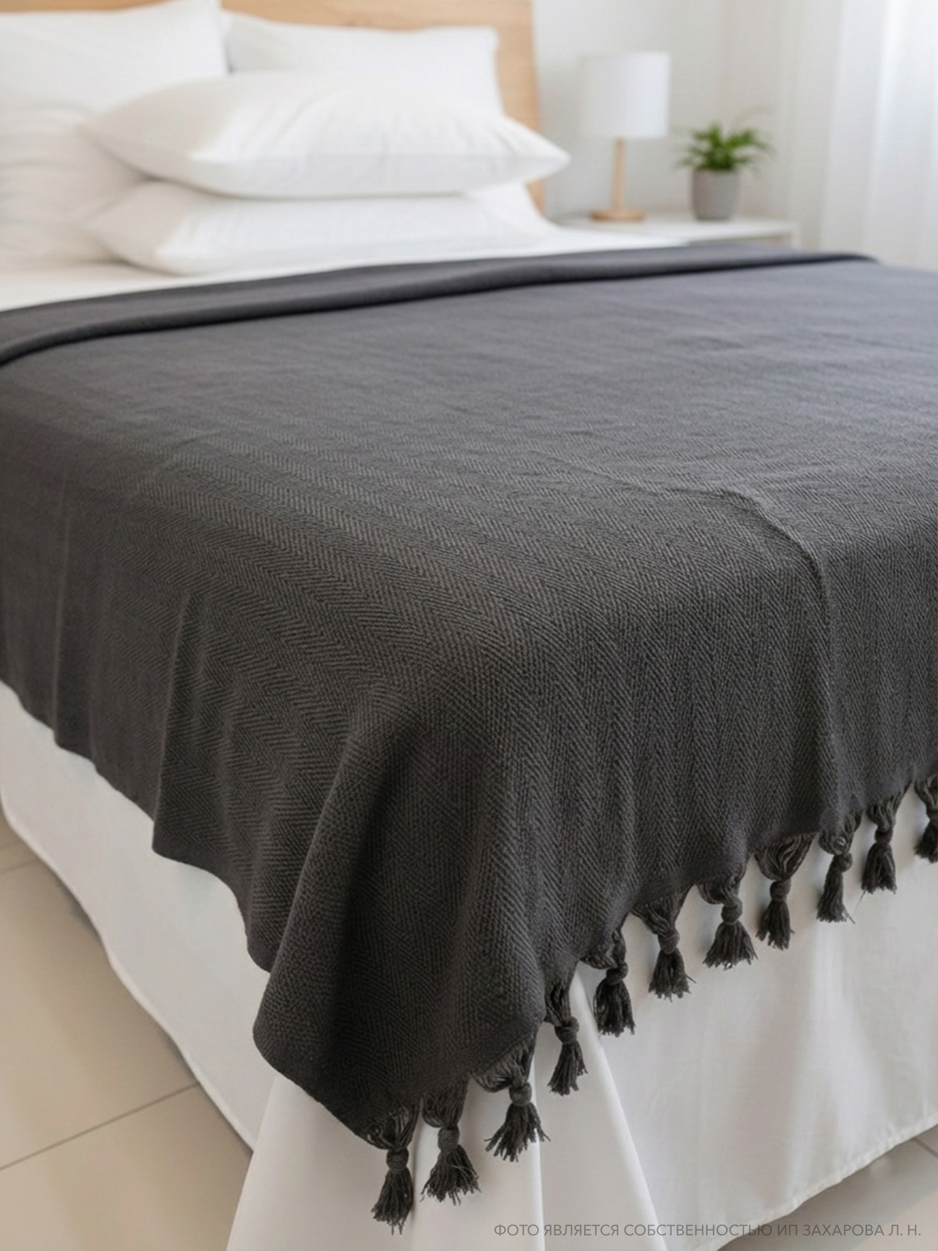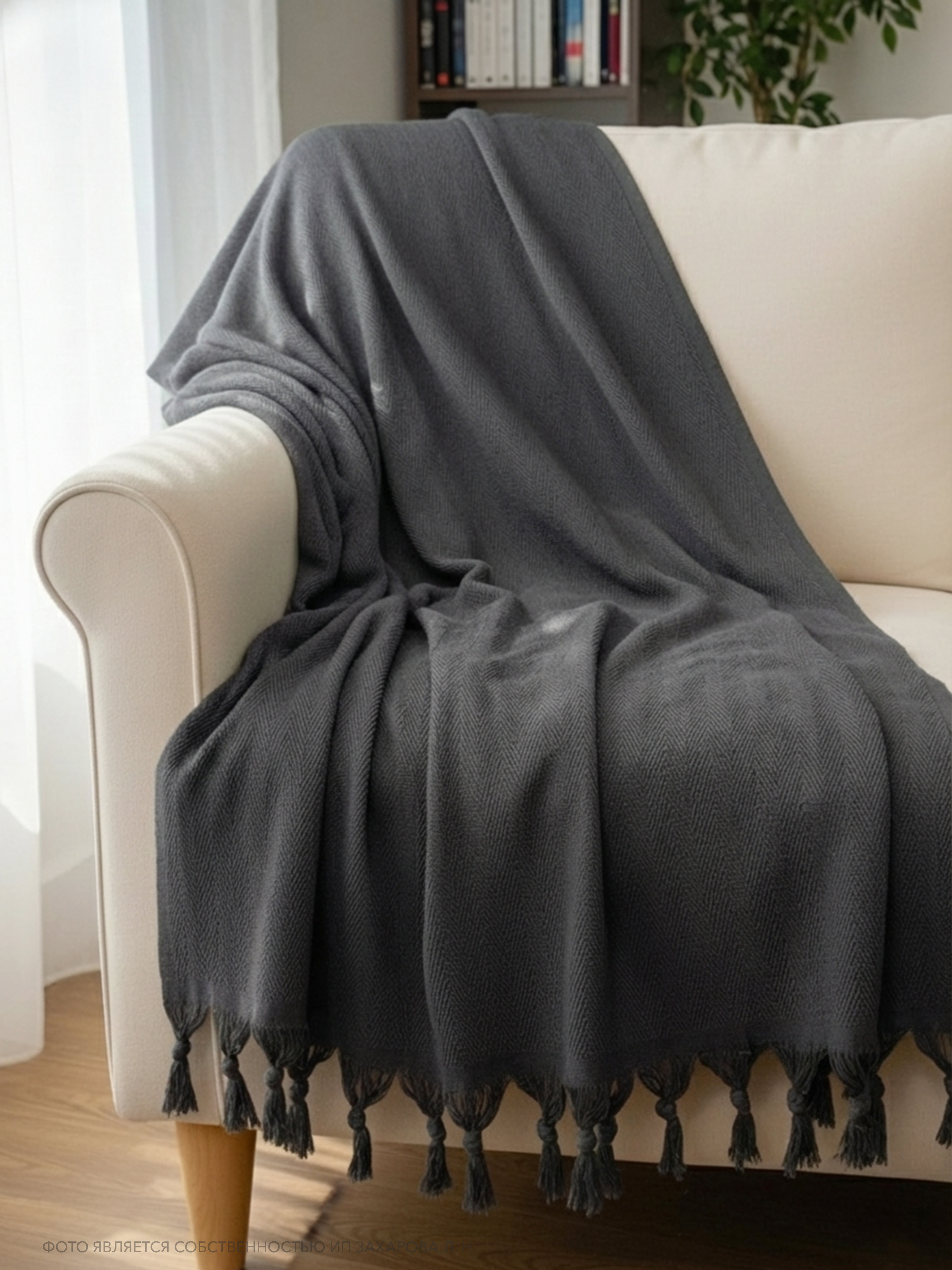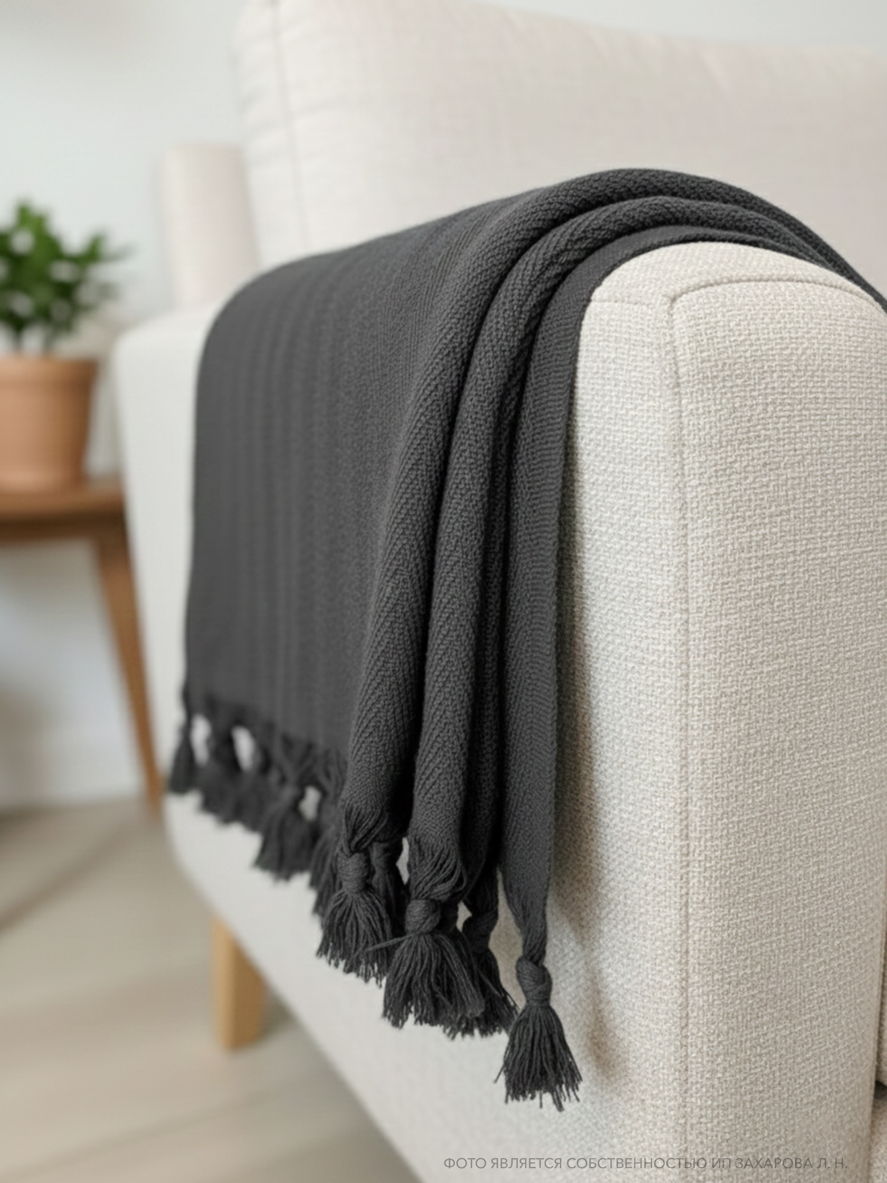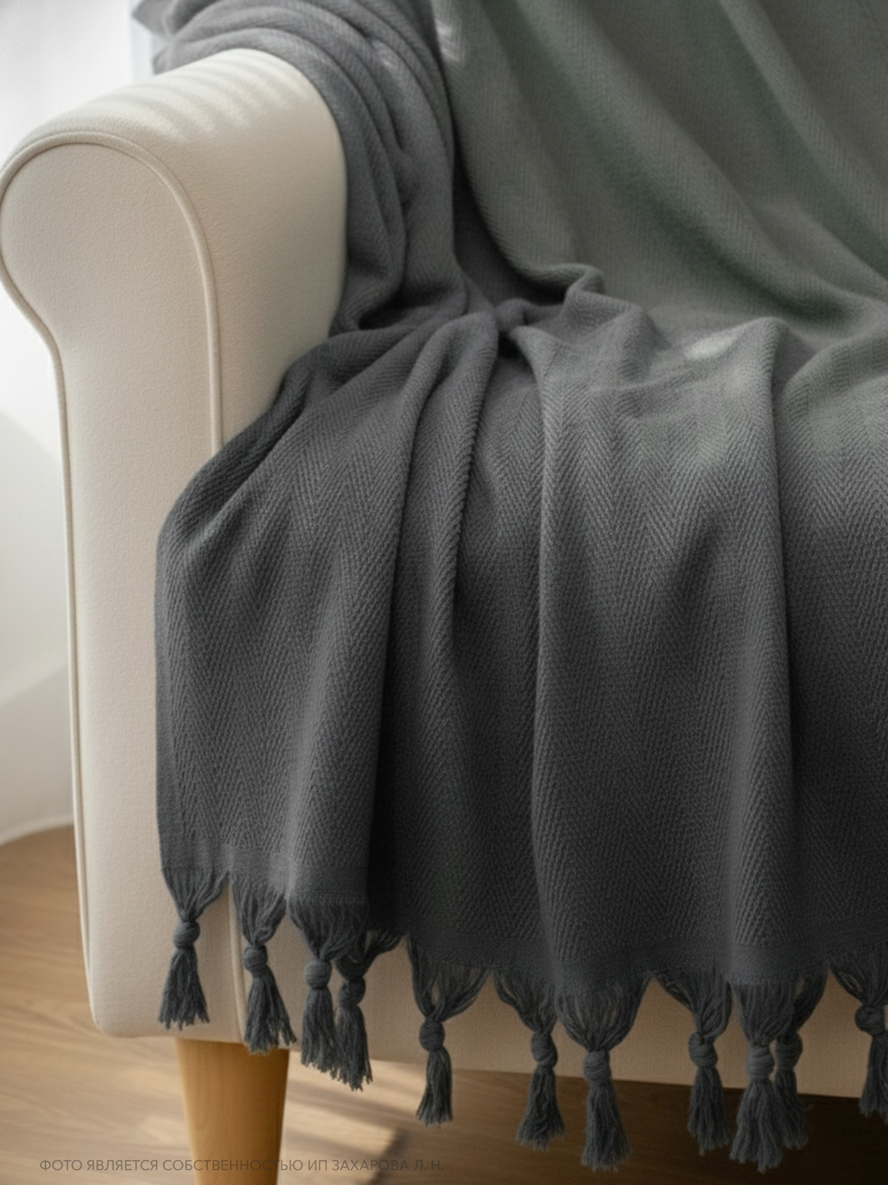 Плед имеет ткань в мелкий рубчик и кисточки по двум сторонам, что придает ему элегантный и стильный вид. Он универсален и подходит для всех сезонов года, так как его можно использовать в качестве пледа или покрывала. Кроме того, он может служить в качестве одеяла, если вам нужно дополнительное тепло.