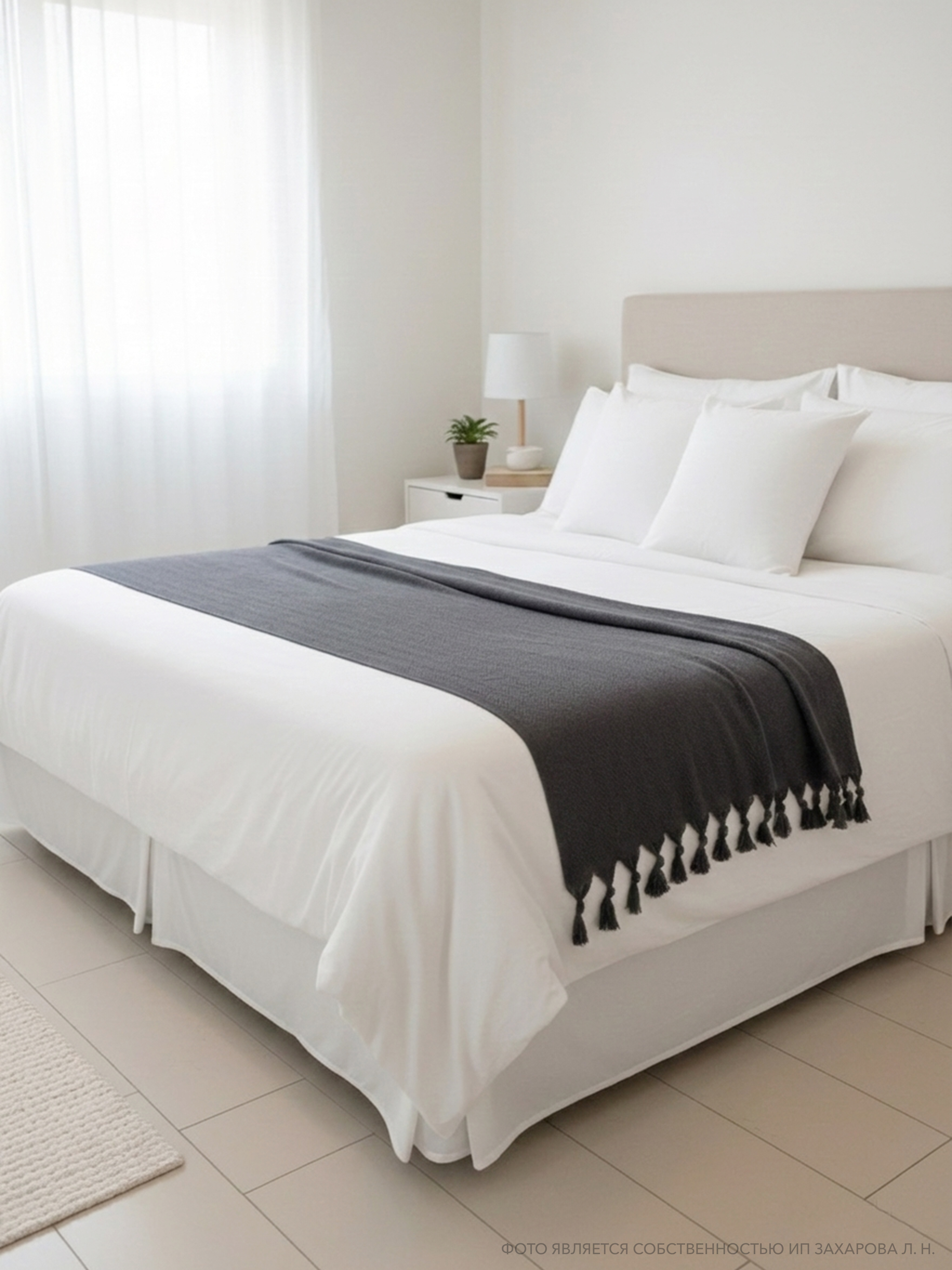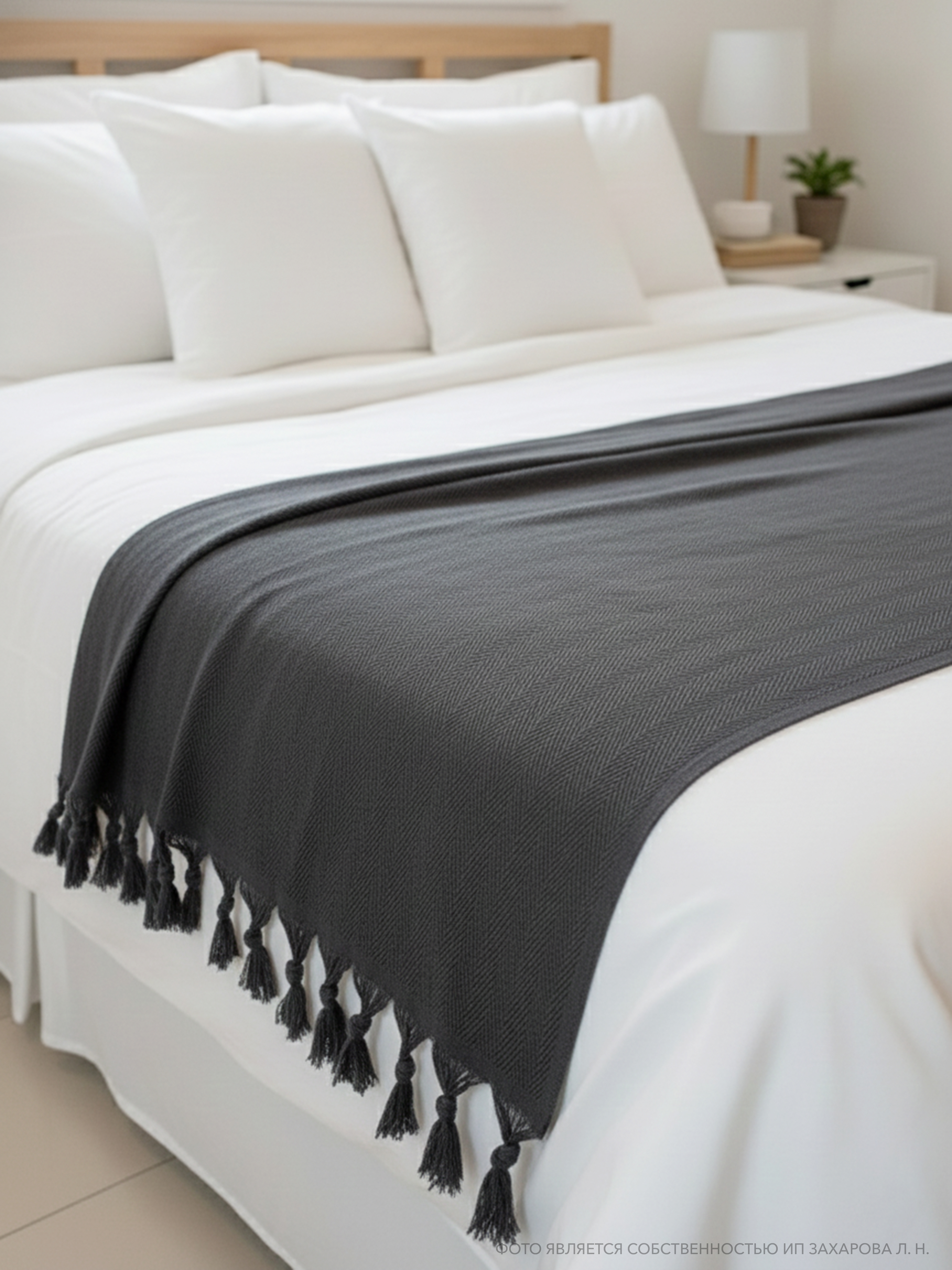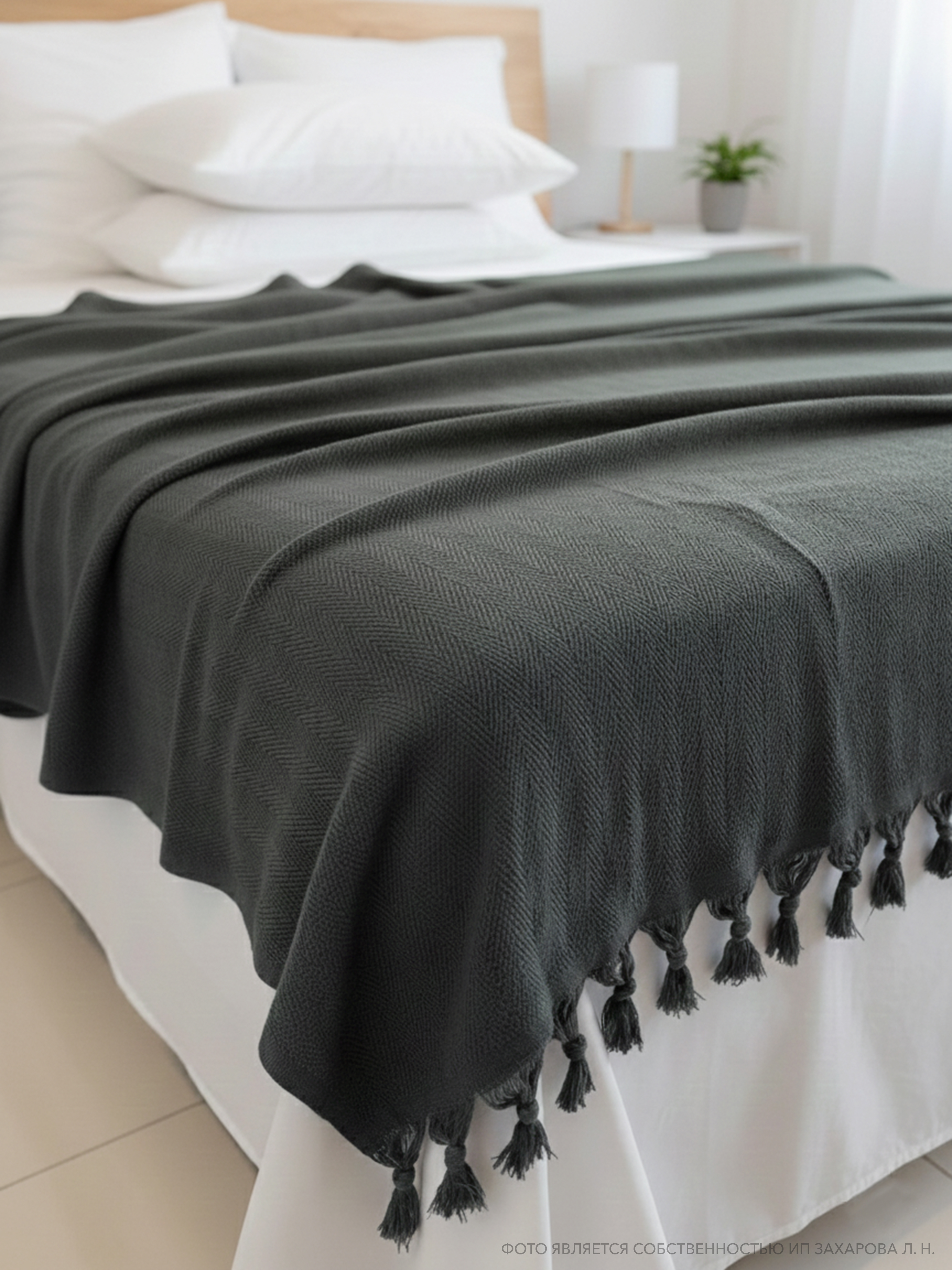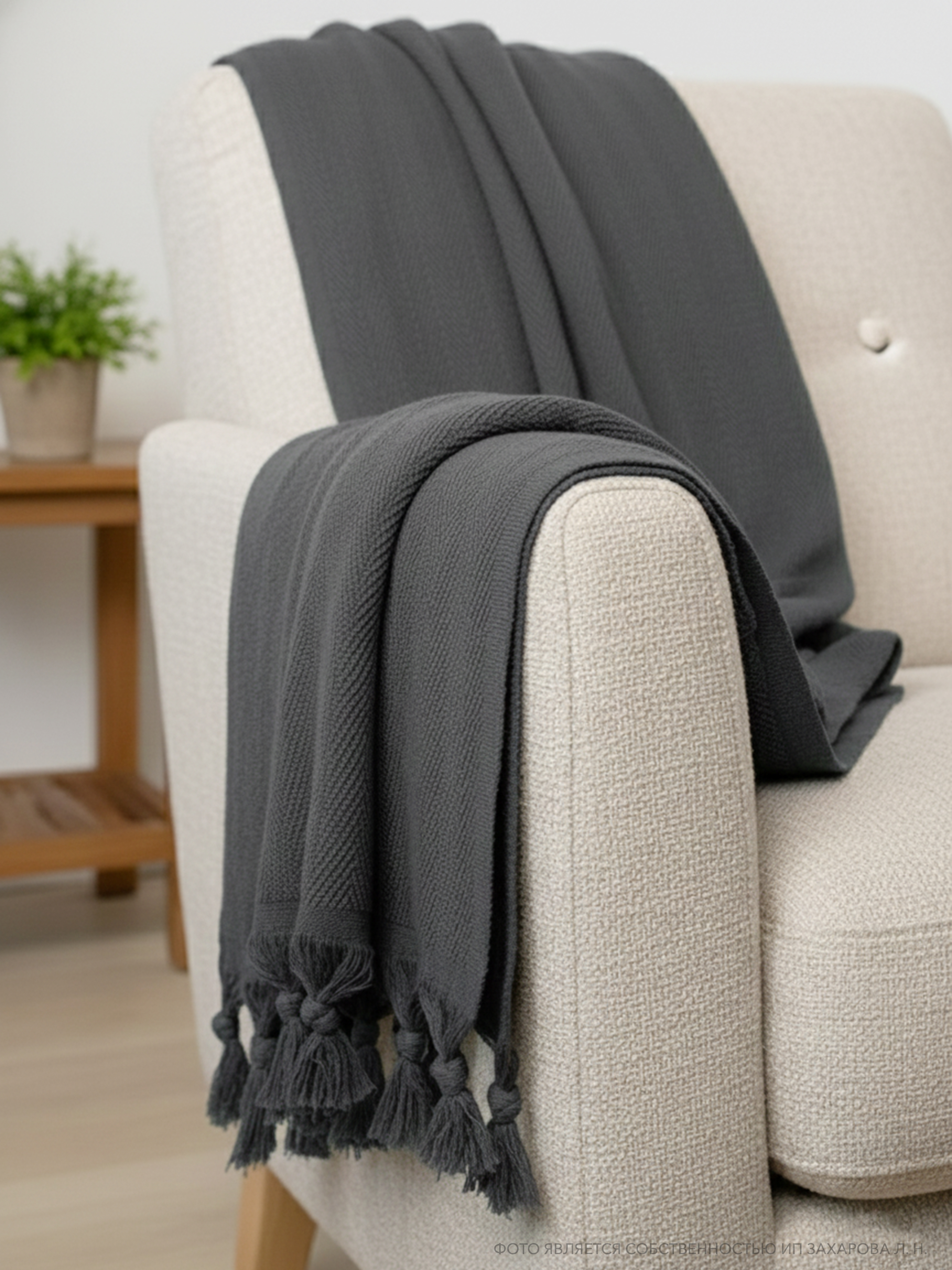 Плед имеет ткань в мелкий рубчик и кисточки по двум сторонам, что придает ему элегантный и стильный вид. Он универсален и подходит для всех сезонов года, так как его можно использовать в качестве пледа или покрывала. Кроме того, он может служить в качестве одеяла, если вам нужно дополнительное тепло.