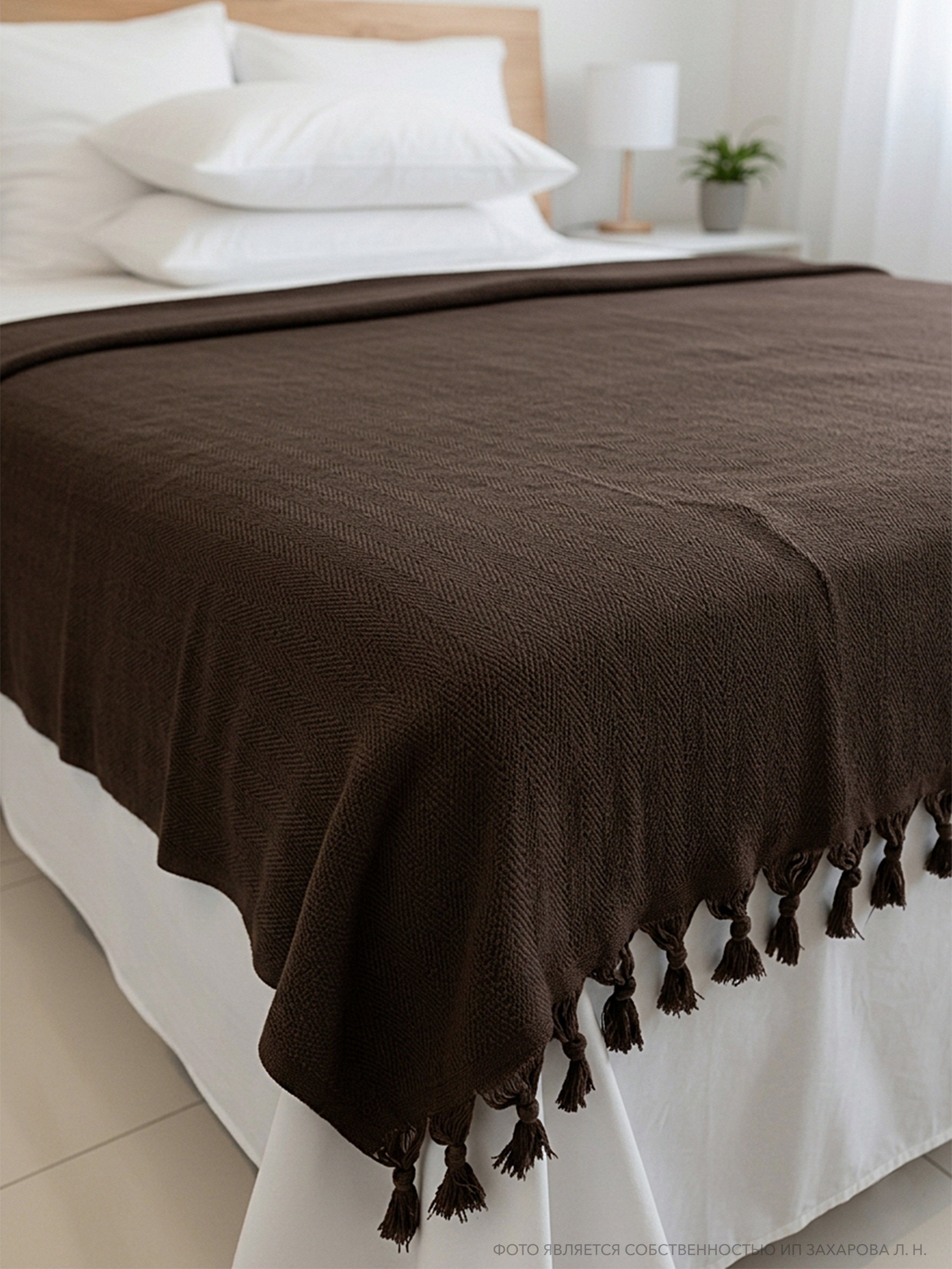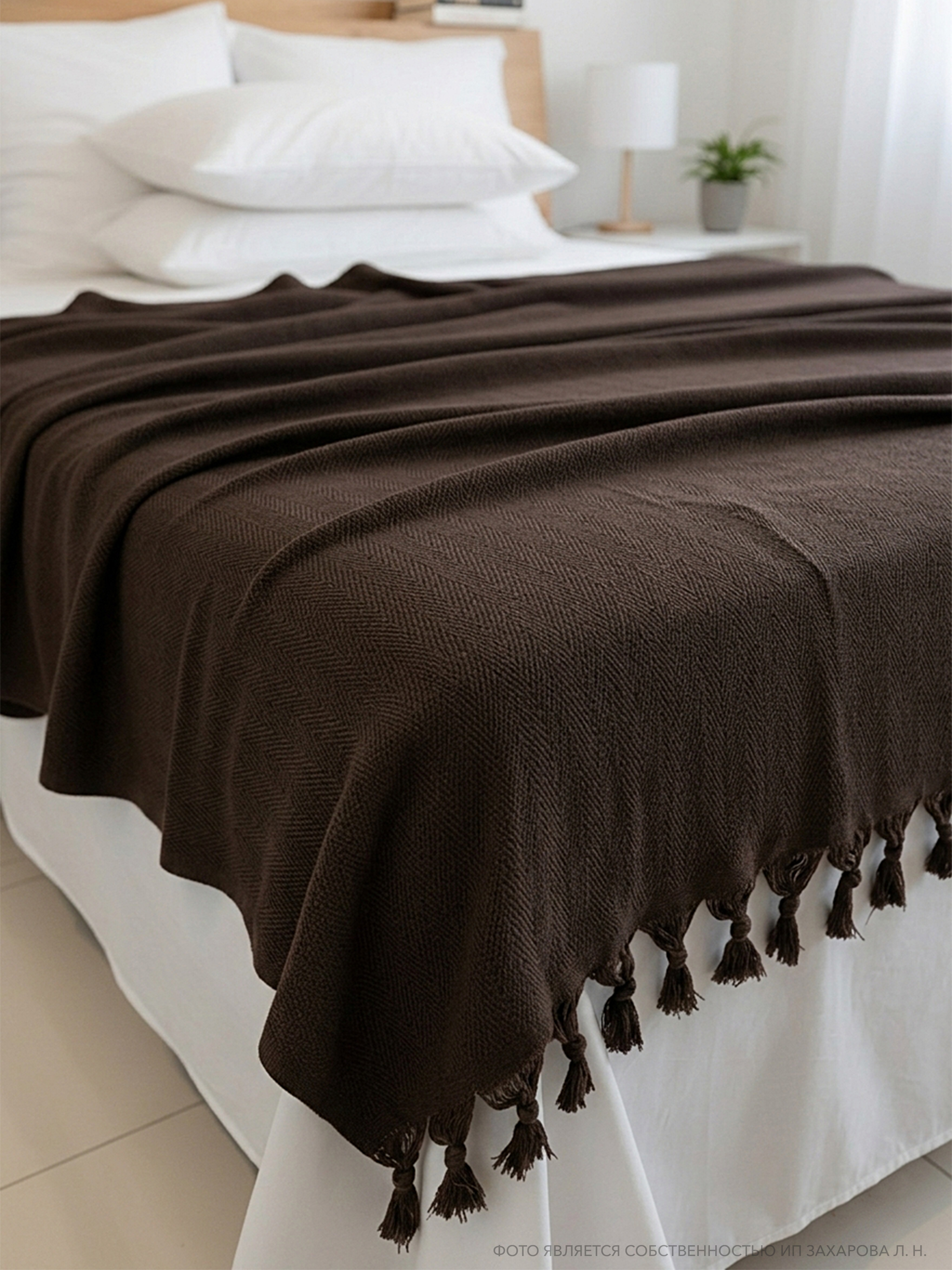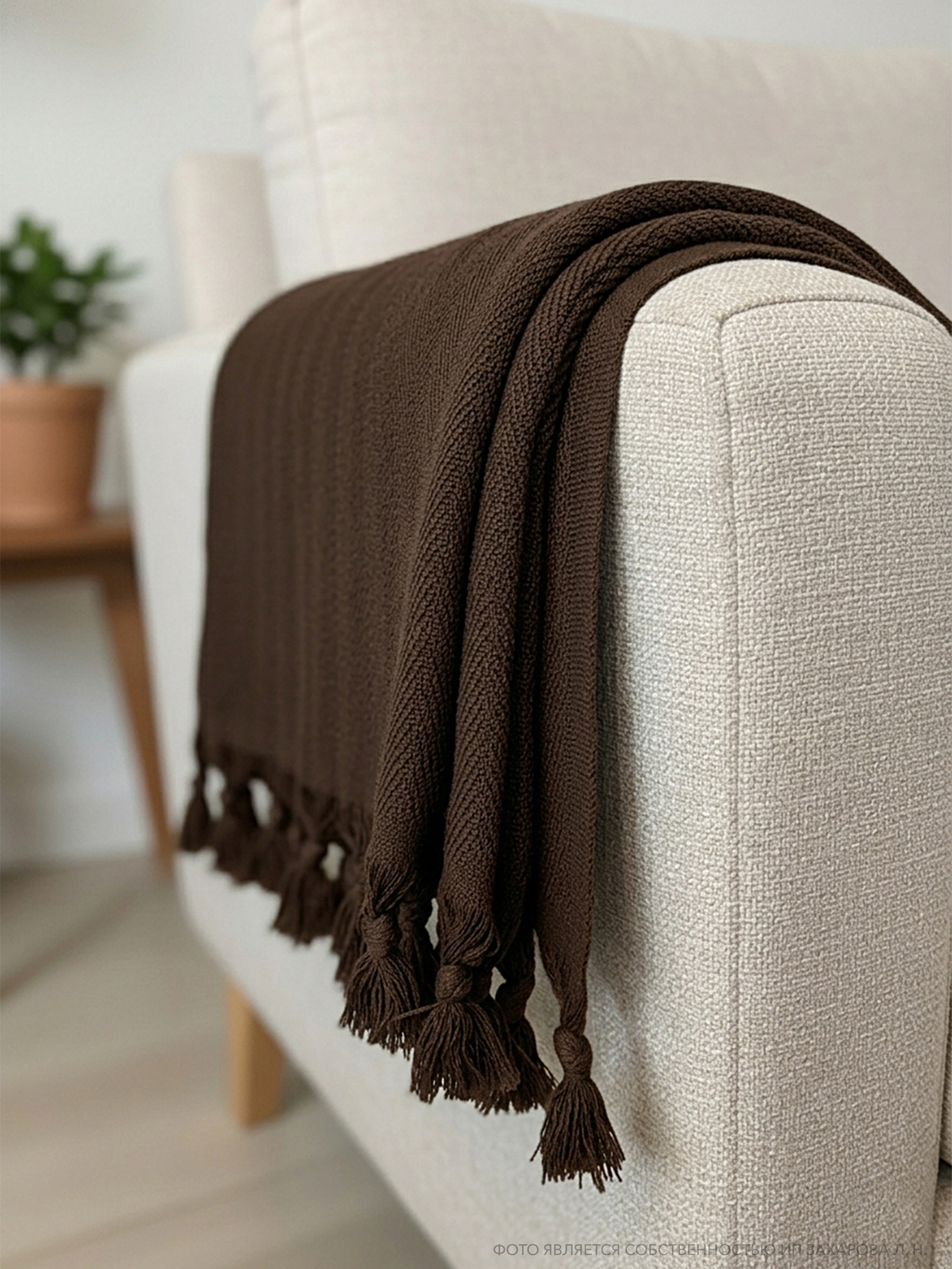 Плед имеет ткань в мелкий рубчик и кисточки по двум сторонам, что придает ему элегантный и стильный вид. Он универсален и подходит для всех сезонов года, так как его можно использовать в качестве пледа или покрывала. Кроме того, он может служить в качестве одеяла, если вам нужно дополнительное тепло.