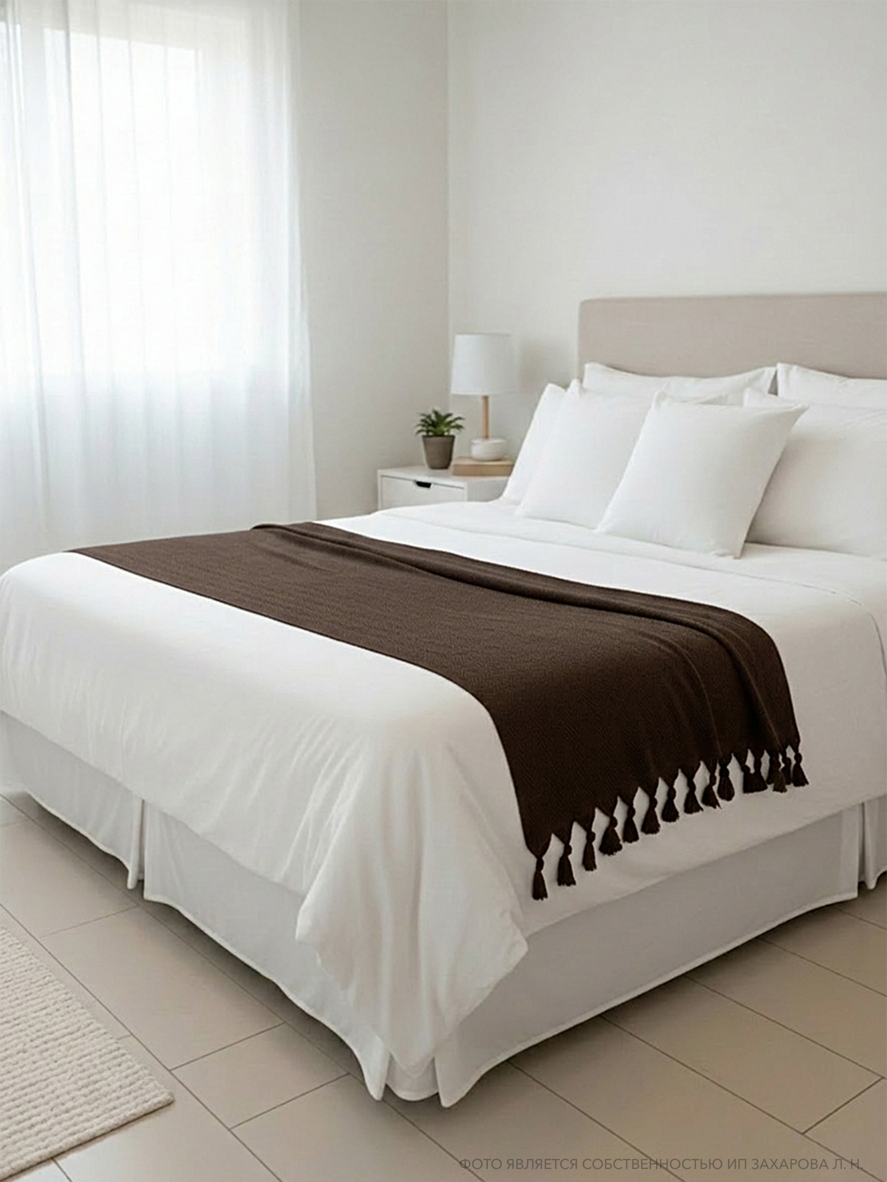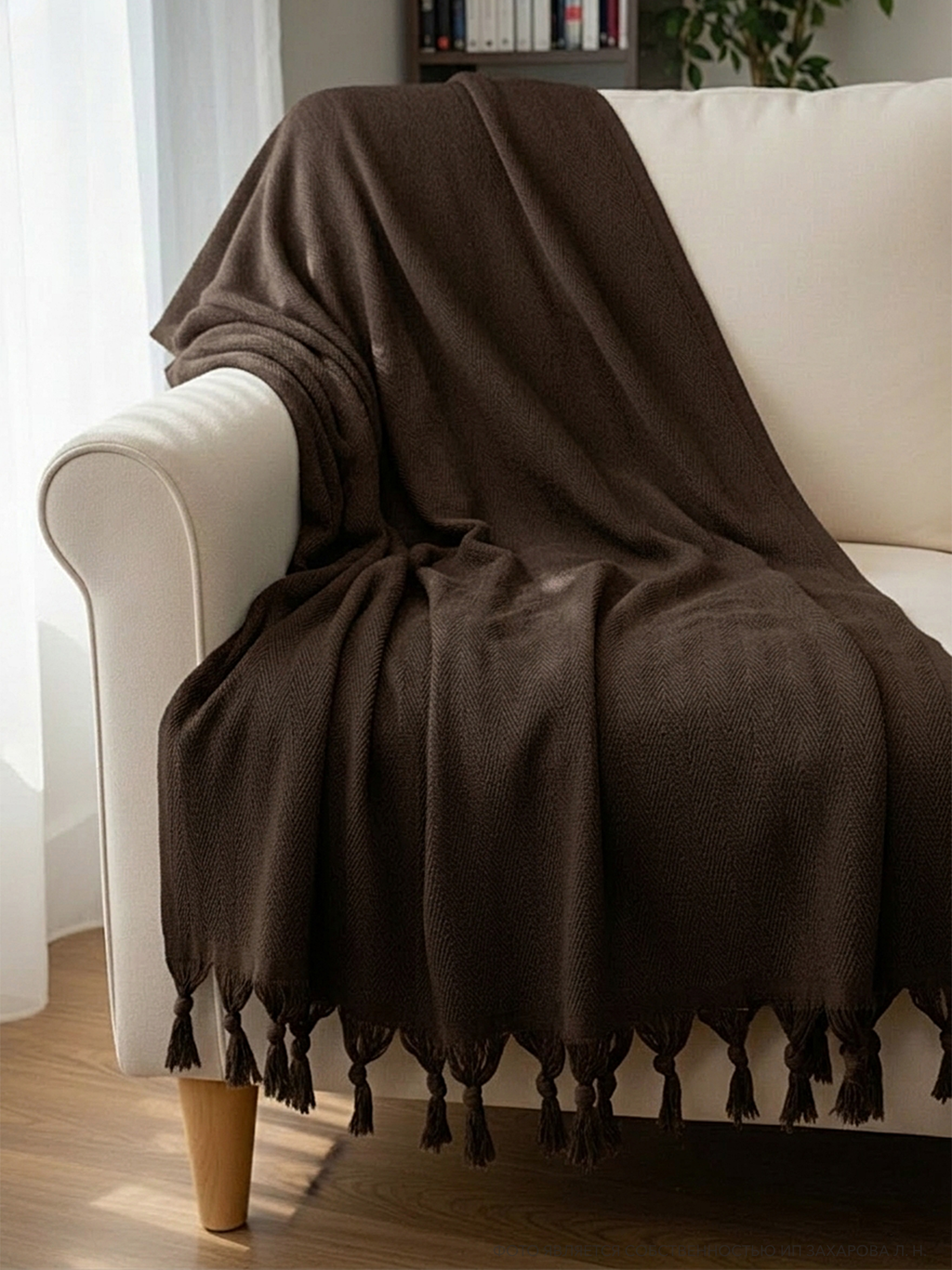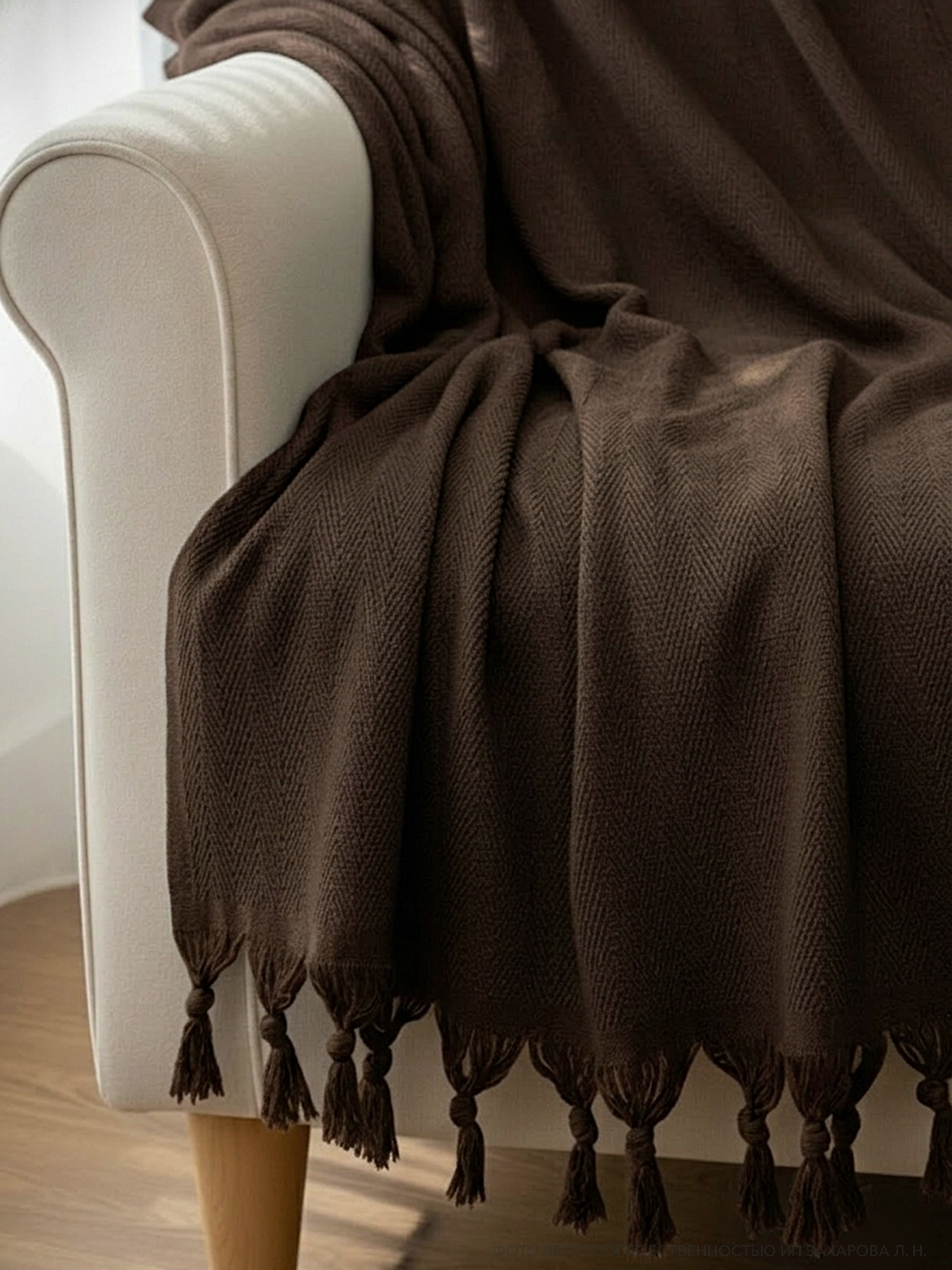 Плед имеет ткань в мелкий рубчик и кисточки по двум сторонам, что придает ему элегантный и стильный вид. Он универсален и подходит для всех сезонов года, так как его можно использовать в качестве пледа или покрывала. Кроме того, он может служить в качестве одеяла, если вам нужно дополнительное тепло.