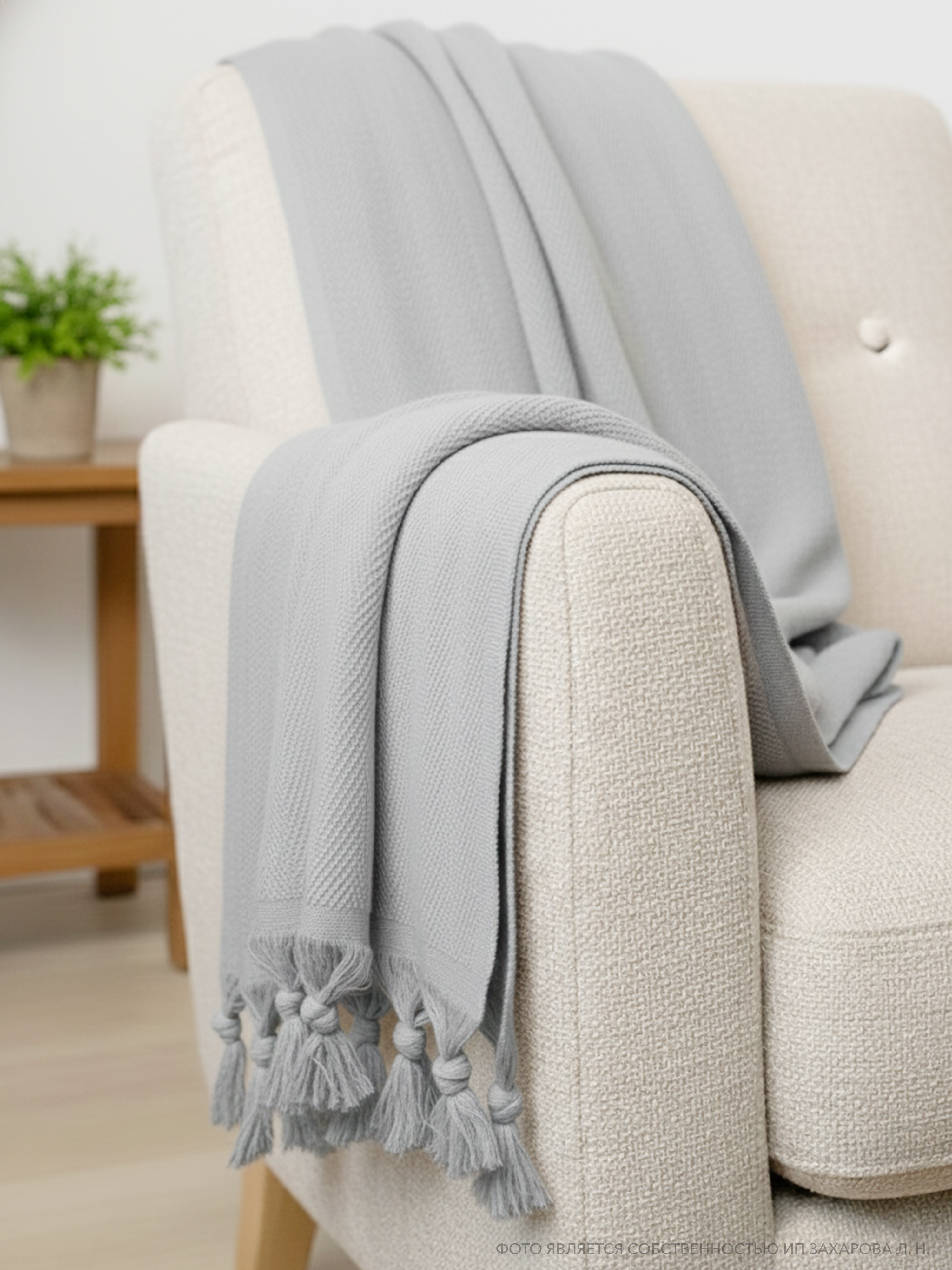 Плед имеет ткань в мелкий рубчик и кисточки по двум сторонам, что придает ему элегантный и стильный вид. Он универсален и подходит для всех сезонов года, так как его можно использовать в качестве пледа или покрывала. Кроме того, он может служить в качестве одеяла, если вам нужно дополнительное тепло.