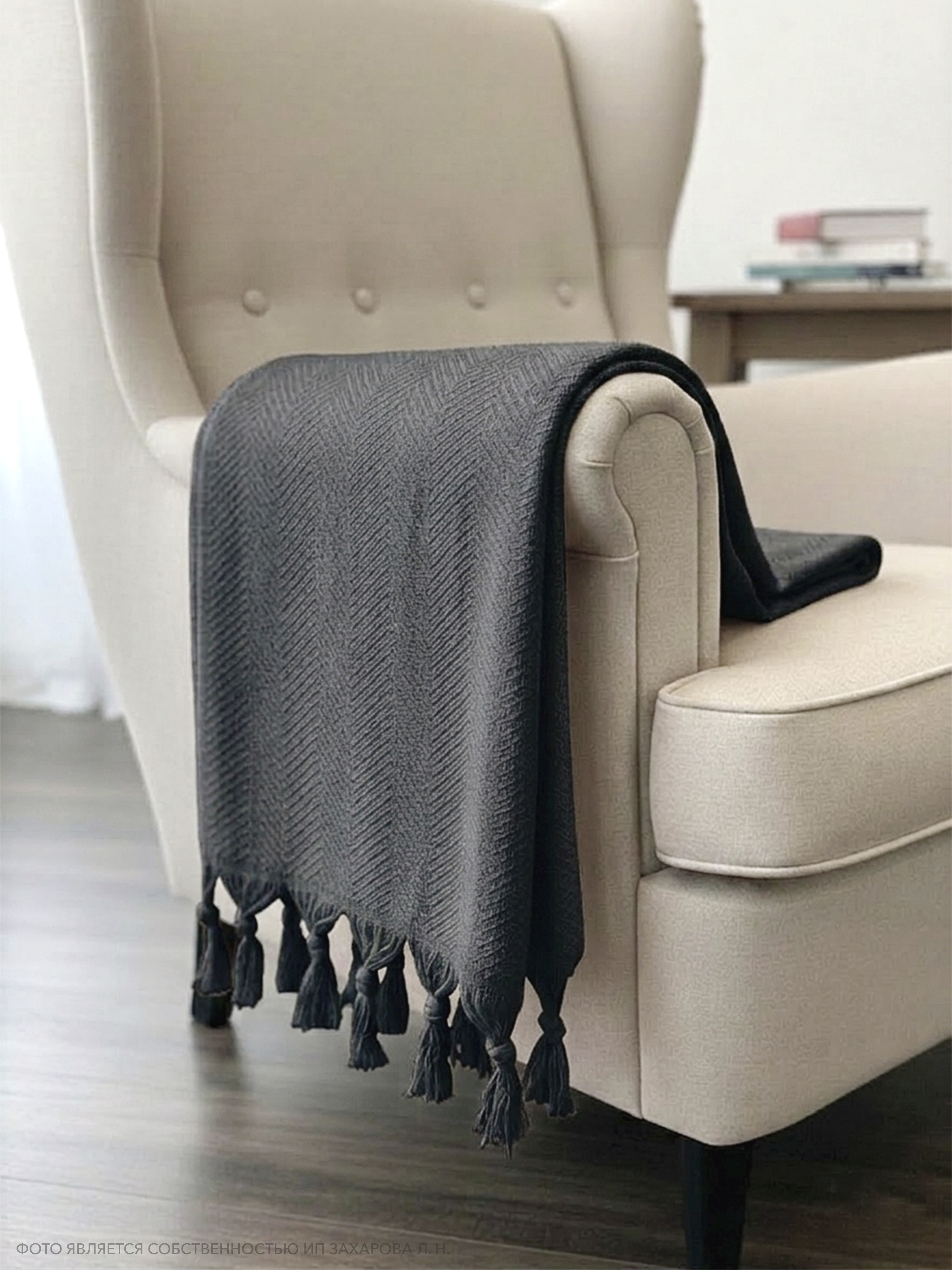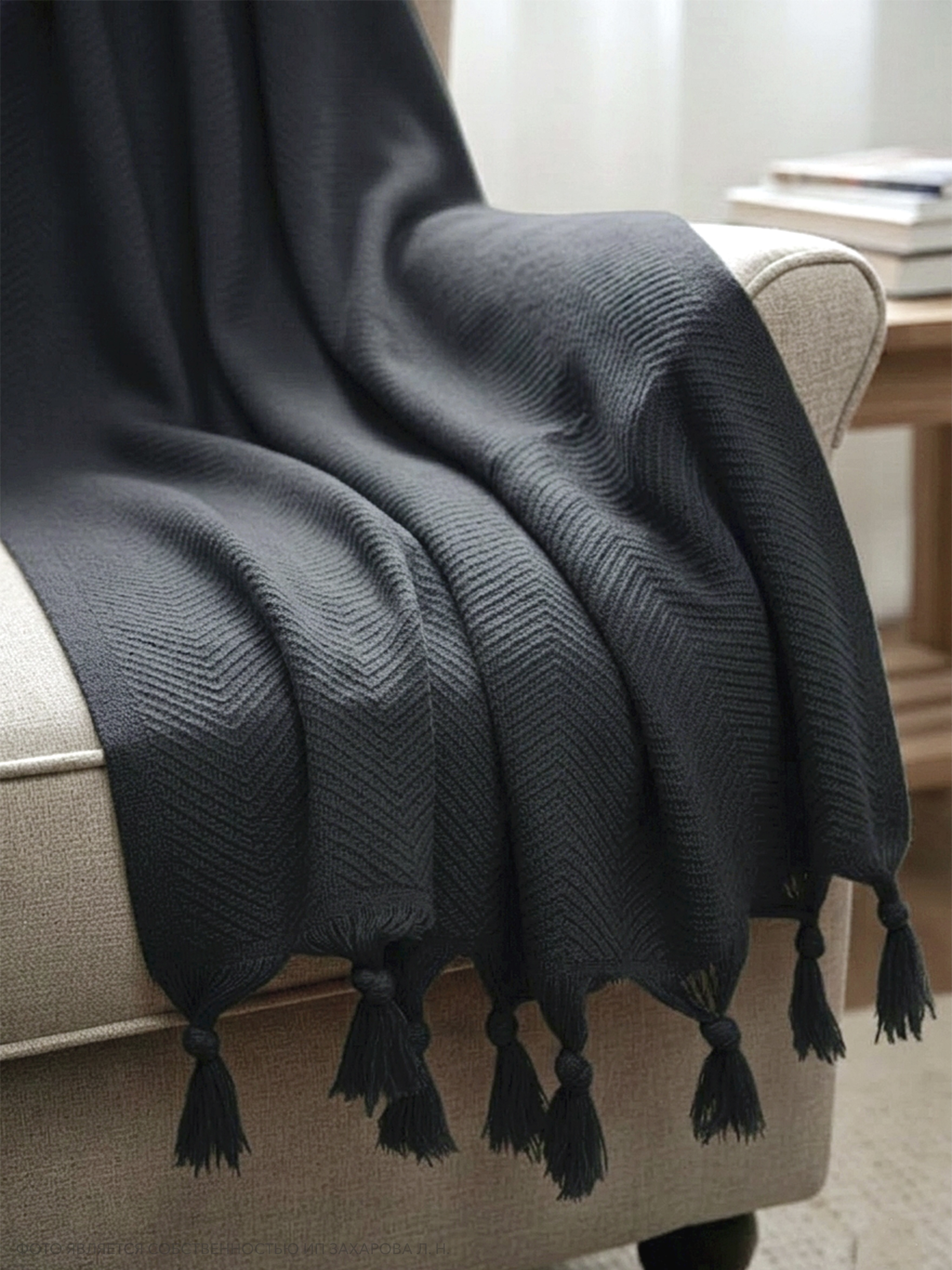 Плед имеет ткань в мелкий рубчик и кисточки по двум сторонам, что придает ему элегантный и стильный вид. Он универсален и подходит для всех сезонов года, так как его можно использовать в качестве пледа или покрывала. Кроме того, он может служить в качестве одеяла, если вам нужно дополнительное тепло.