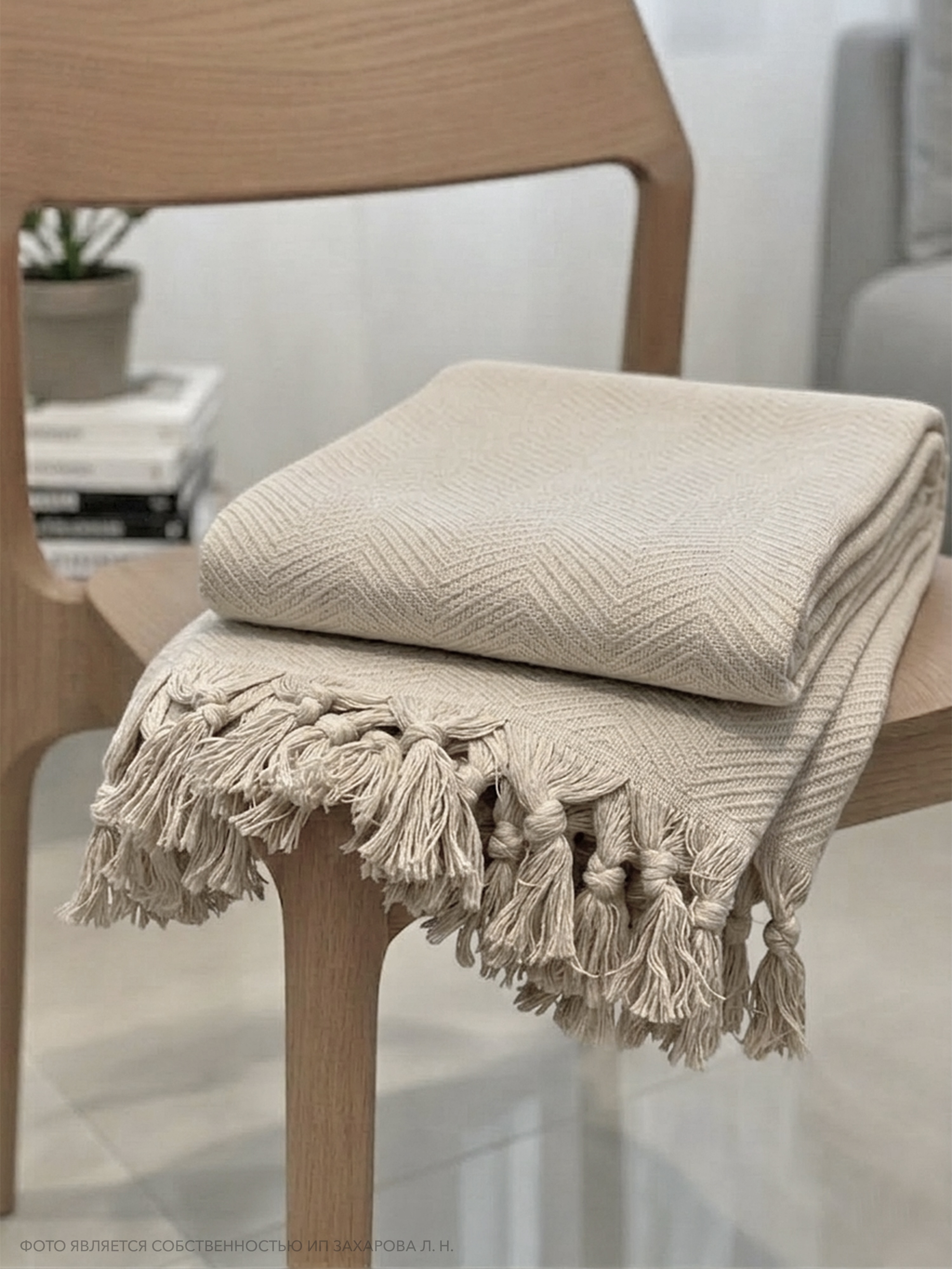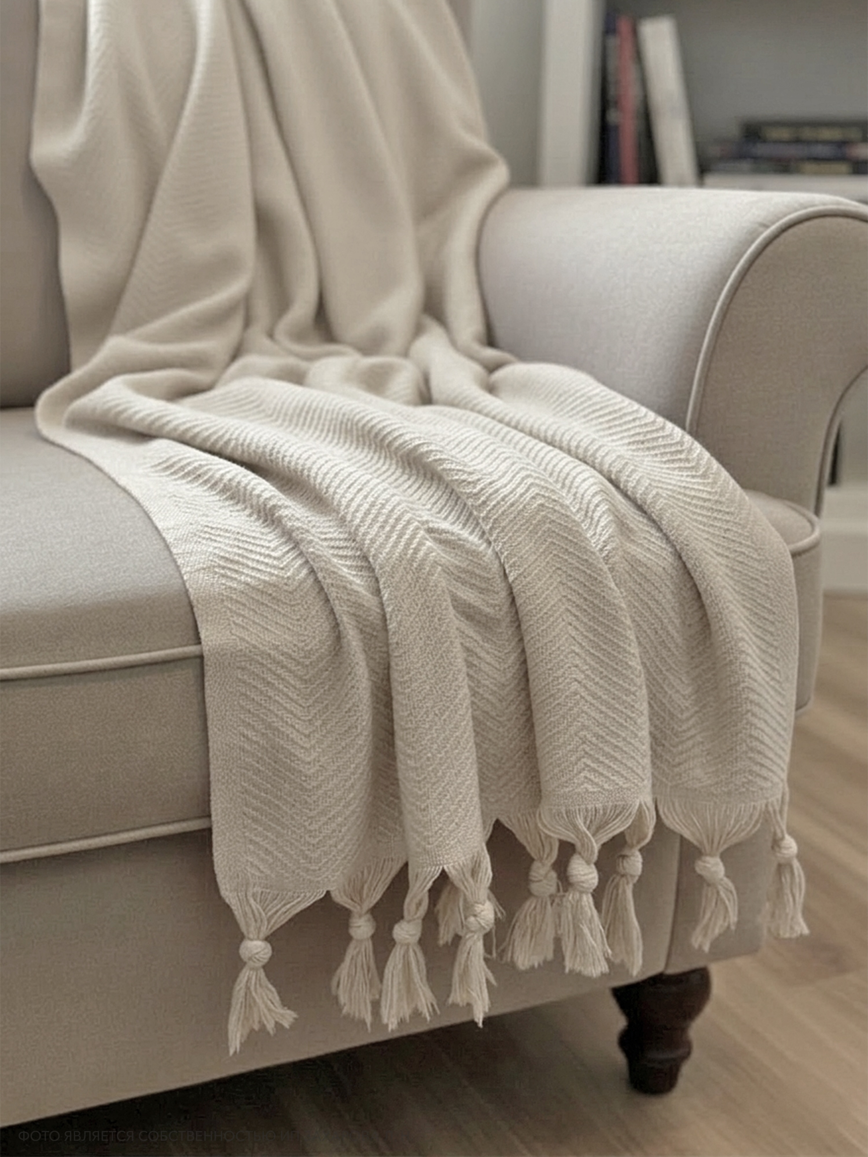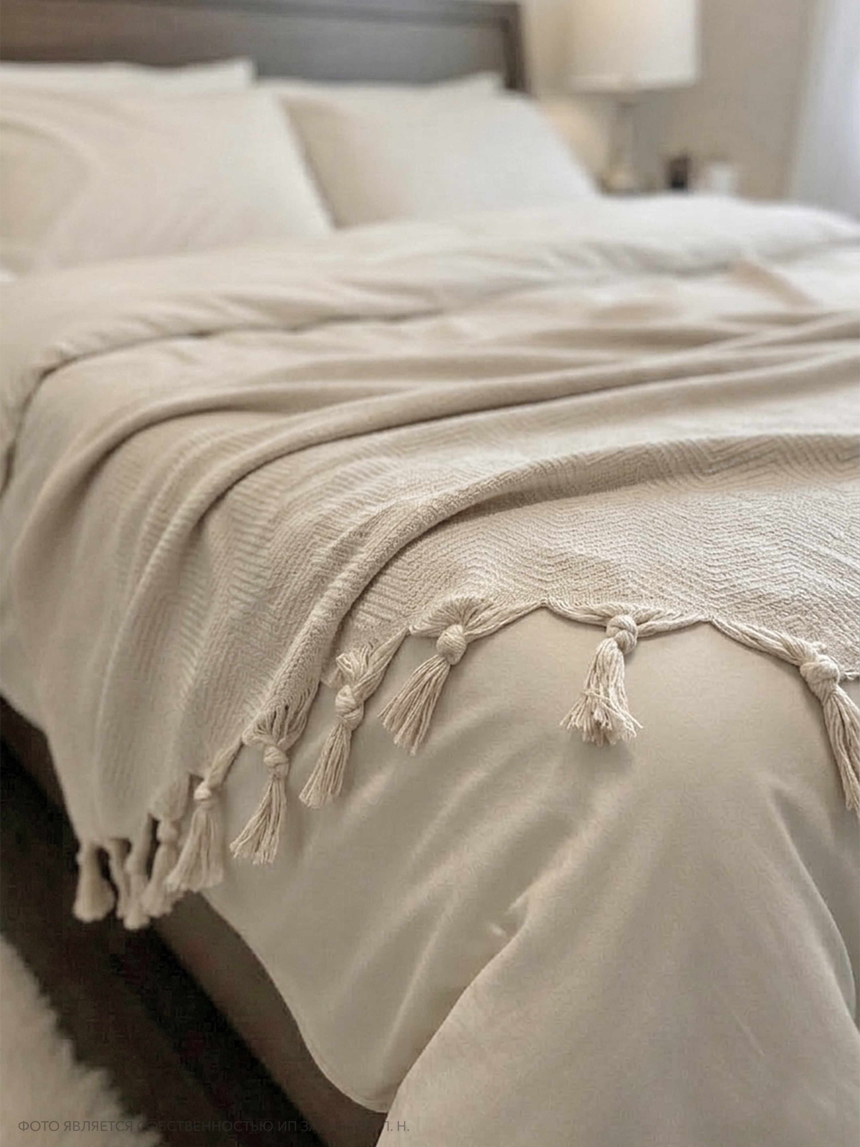 Плед имеет ткань в мелкий рубчик и кисточки по двум сторонам, что придает ему элегантный и стильный вид. Он универсален и подходит для всех сезонов года, так как его можно использовать в качестве пледа или покрывала. Кроме того, он может служить в качестве одеяла, если вам нужно дополнительное тепло.