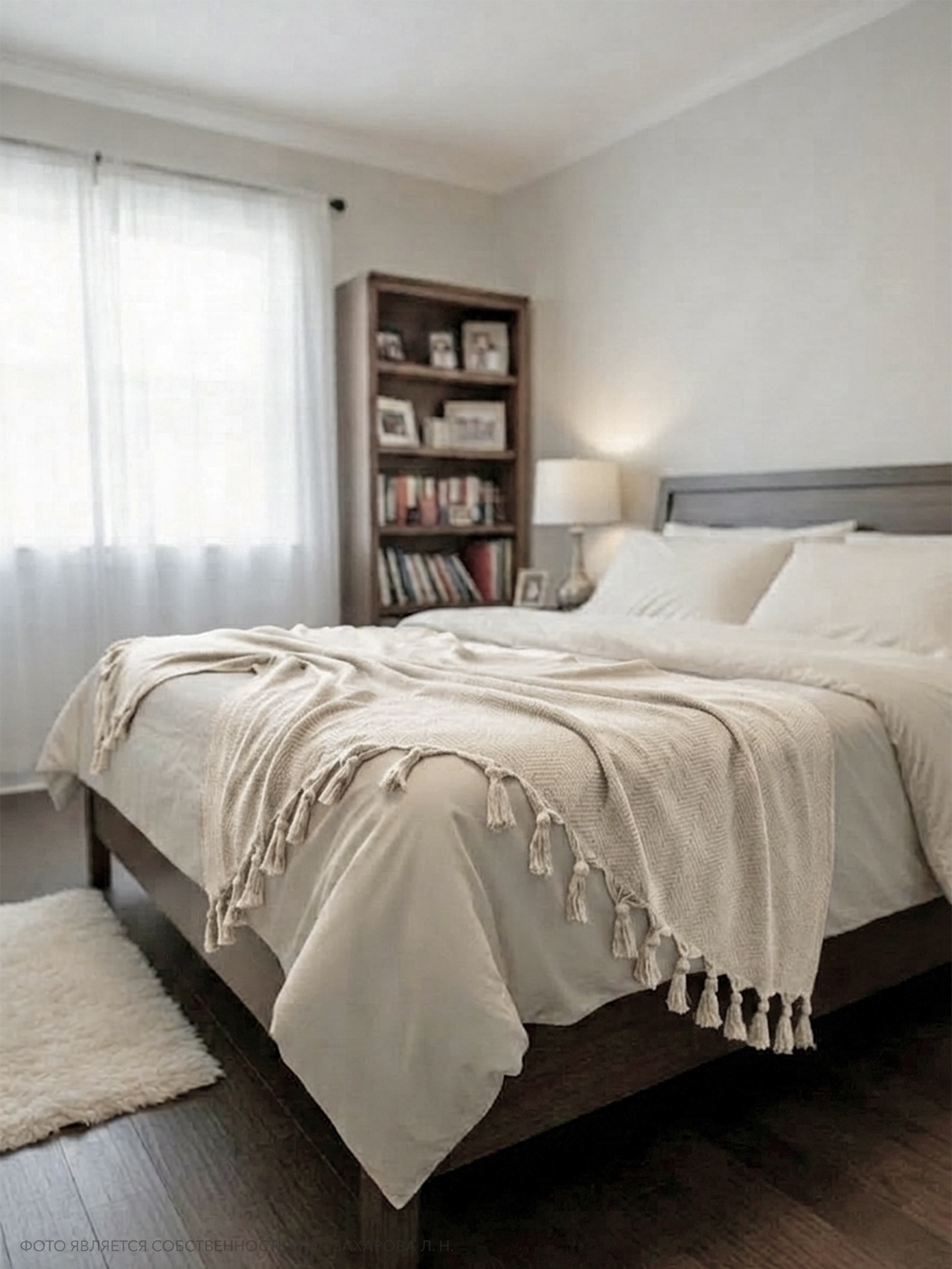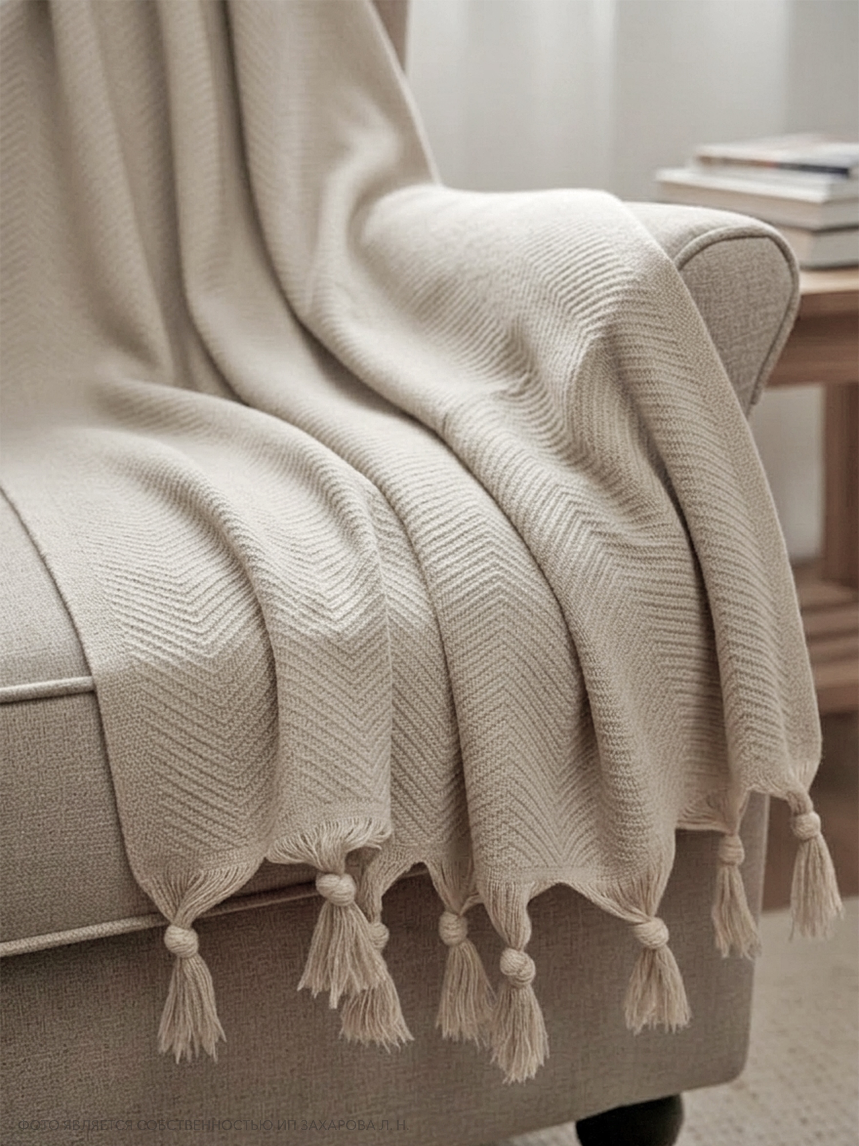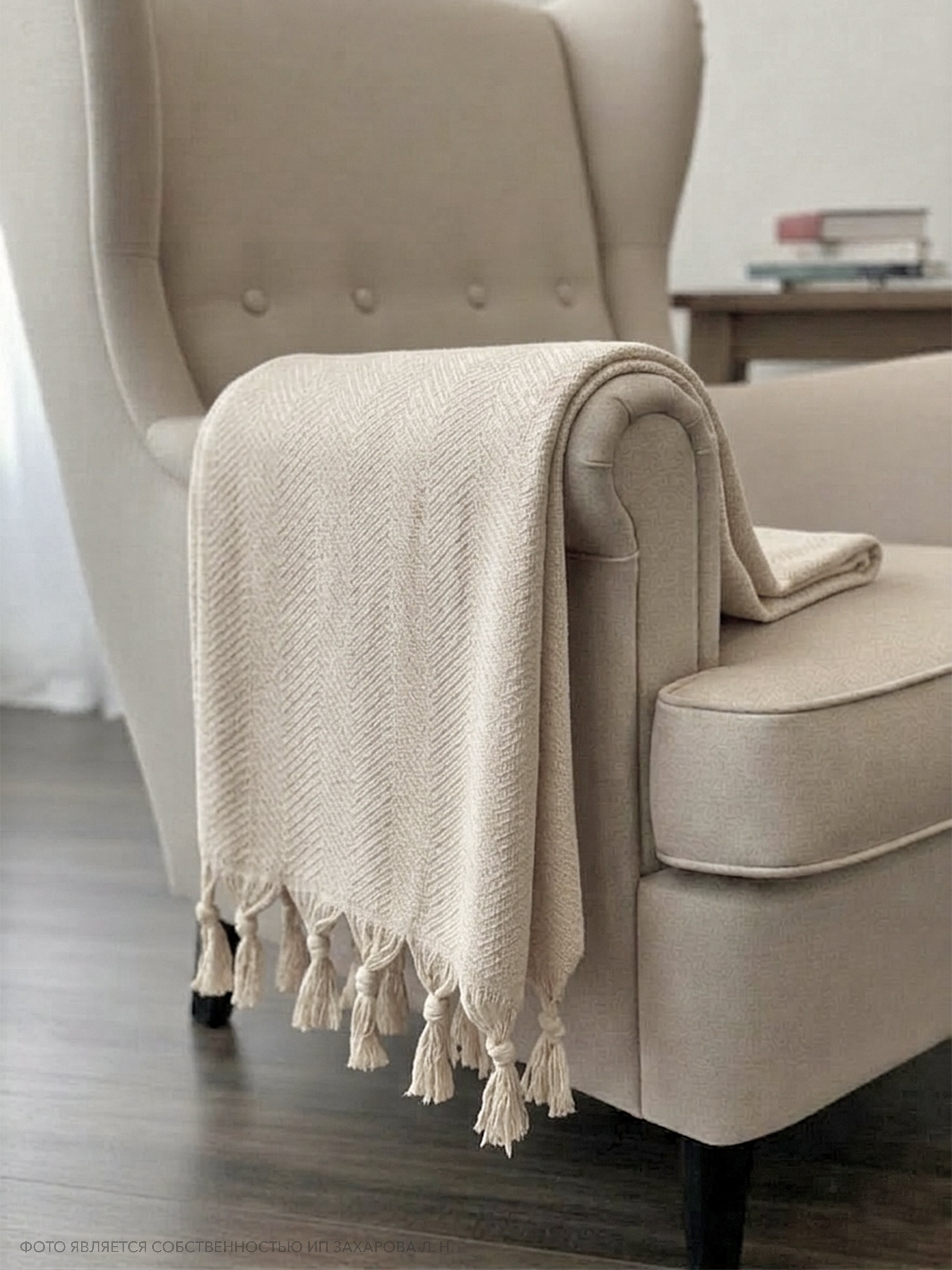 Плед имеет ткань в мелкий рубчик и кисточки по двум сторонам, что придает ему элегантный и стильный вид. Он универсален и подходит для всех сезонов года, так как его можно использовать в качестве пледа или покрывала. Кроме того, он может служить в качестве одеяла, если вам нужно дополнительное тепло.